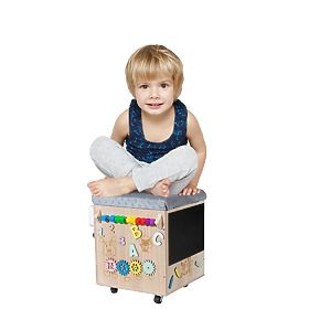 Drewniany taboret Montessori z elementami manipulacyjnymi i schowkiem. .. więcej