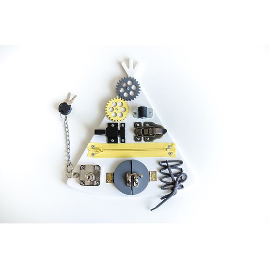 Oryginalna drewniana plansza do gry w kształcie białego tipi, dzięki której dzieci mogą w zabawny sposób ćwiczyć zdolności motoryczne, kreatywność, logiczne myślenie, a także koncentrację.