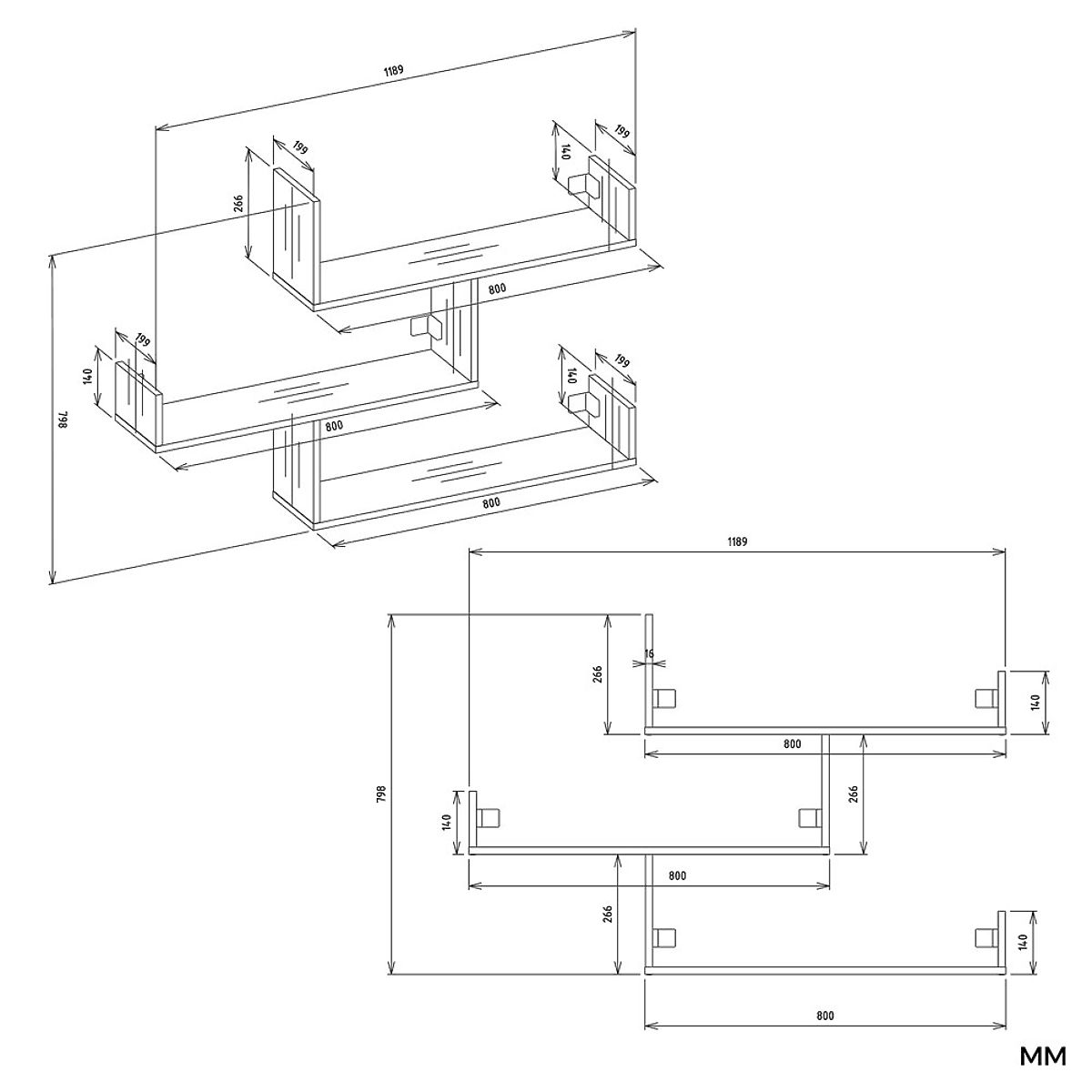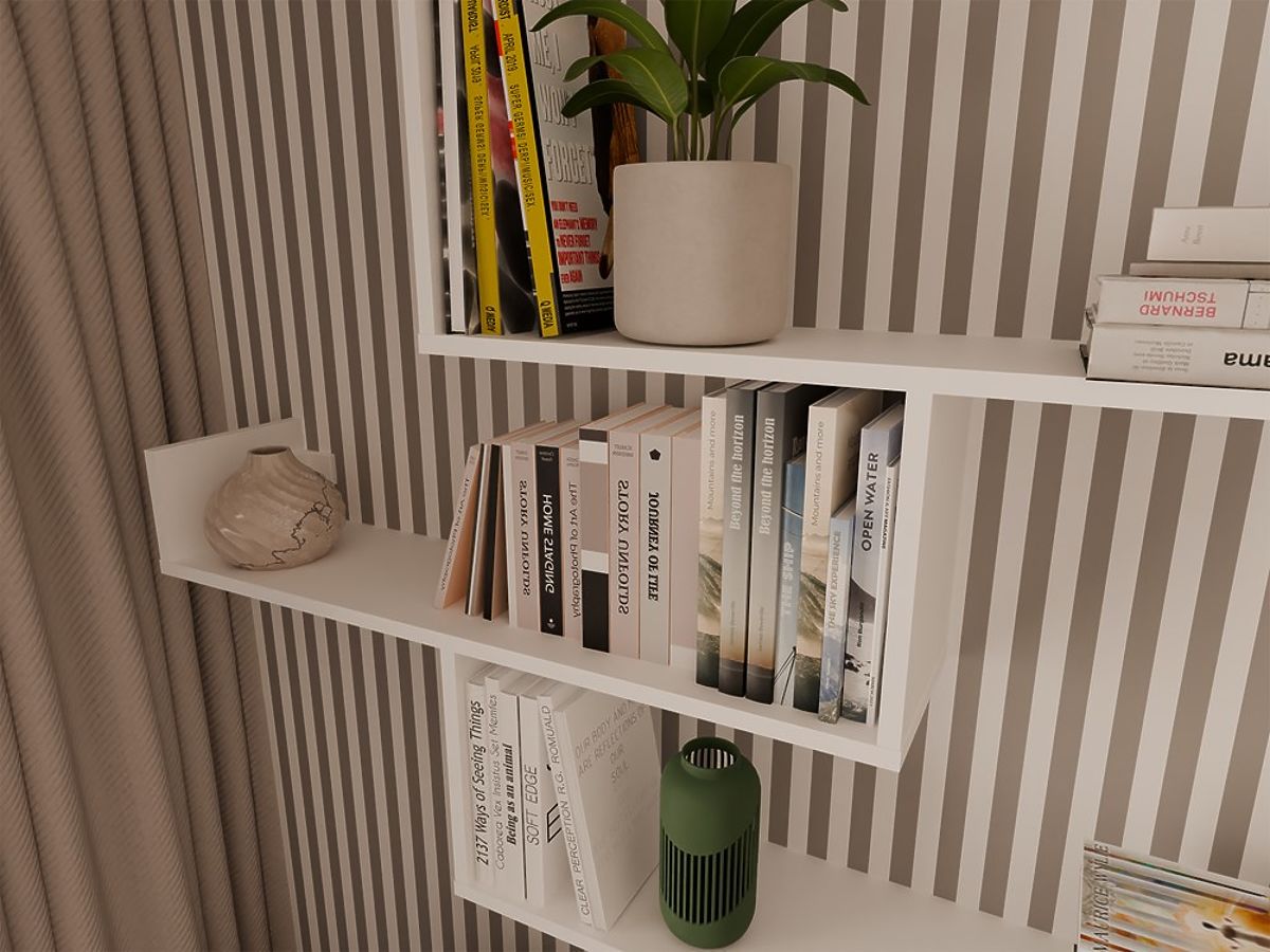 Dzięki przemyślanej konstrukcji i praktycznym bocznym ściankom półki są idealne do przechowywania książek, ramek, roślin i dekoracyjnych drobiazgów. Każda półka ma estetyczne elementy mocujące i może być zawieszona samodzielnie lub jako całość – według Twojego pomysłu.