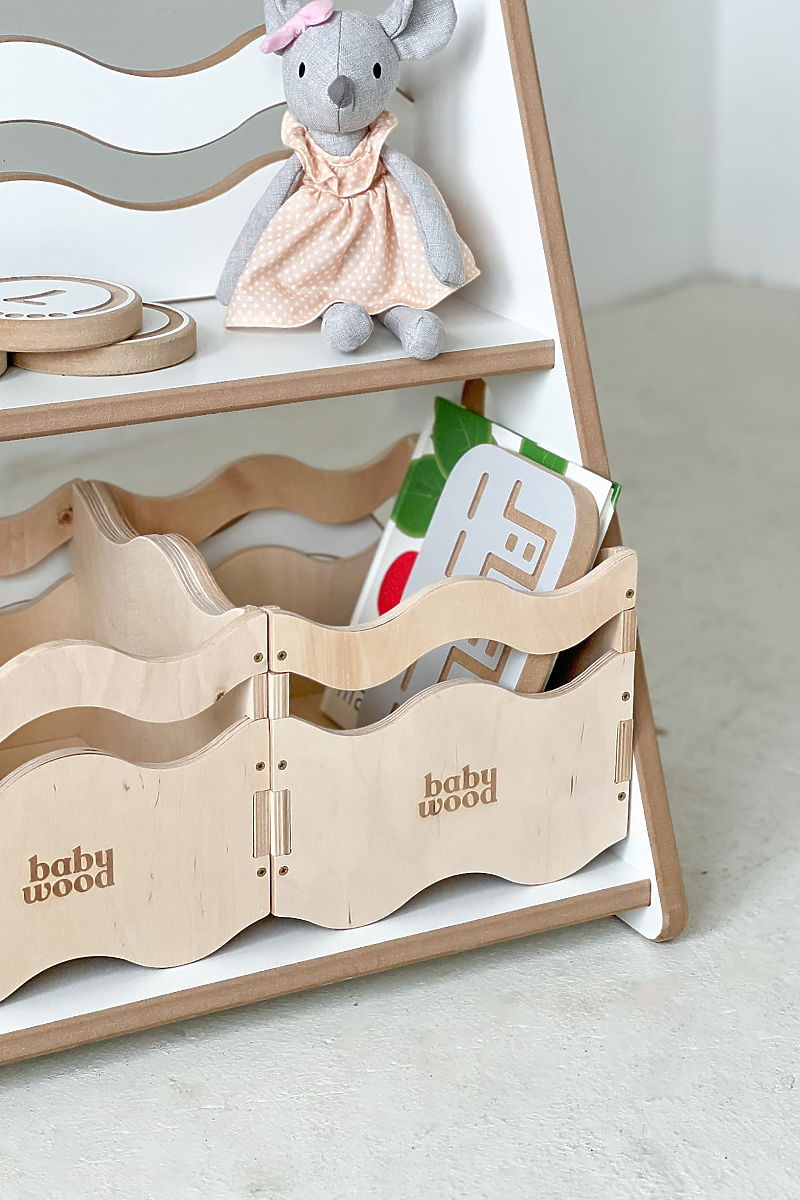 Biblioteczka i regał WAVE M łączy dwie funkcje w jednym – górna część służy jako biblioteczka, a dolna część jako przestrzeń do przechowywania zabawek. Ten praktyczny design jest idealny dla rodziców, którzy chcą mieć wszystko w jednym miejscu, bez potrzeby posiadania dwóch oddzielnych mebli. Faliste przednie listwy łączą funkcjonalność z nowoczesnym designem – są bezpieczne dla dzieci i jednocześnie stylowe. Dzięki ergonomicznej wysokości mały użytkownik łatwo sięga po książki i zabawki, co wspiera samodzielność w duchu Montessori.