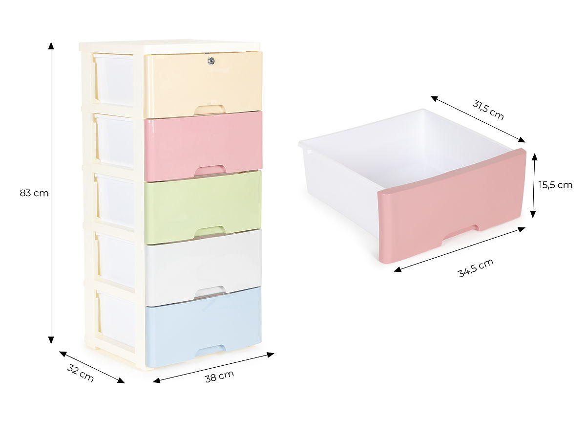 Regał składa się z pięciu kolorowych szuflad, ze specjalnie profilowanym uchwytem z przodu, co ułatwia ich wsuwanie i wysuwanie.