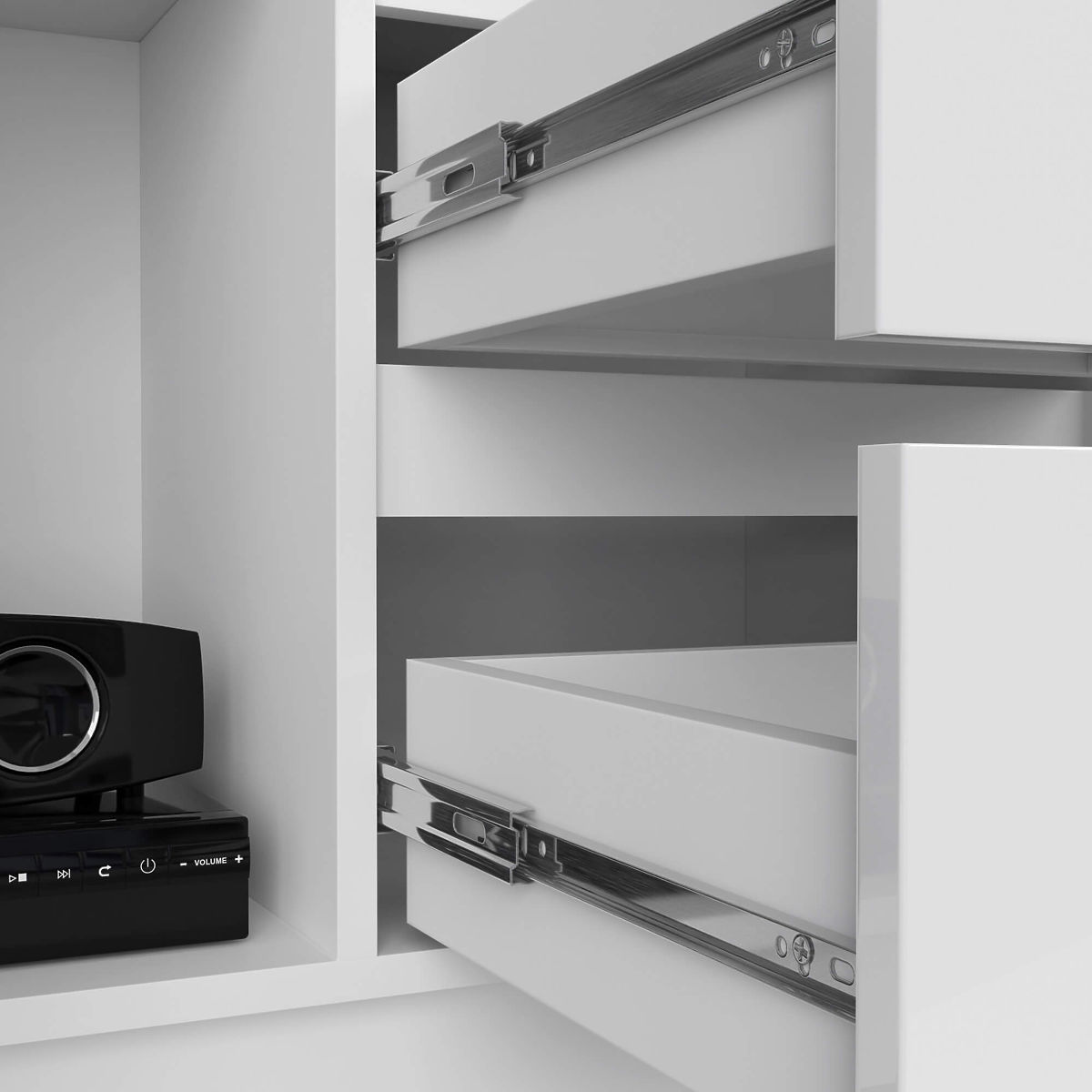 - Szuflady poruszają się na metalowych prowadnicach kulkowych z blokadą wysunięcia