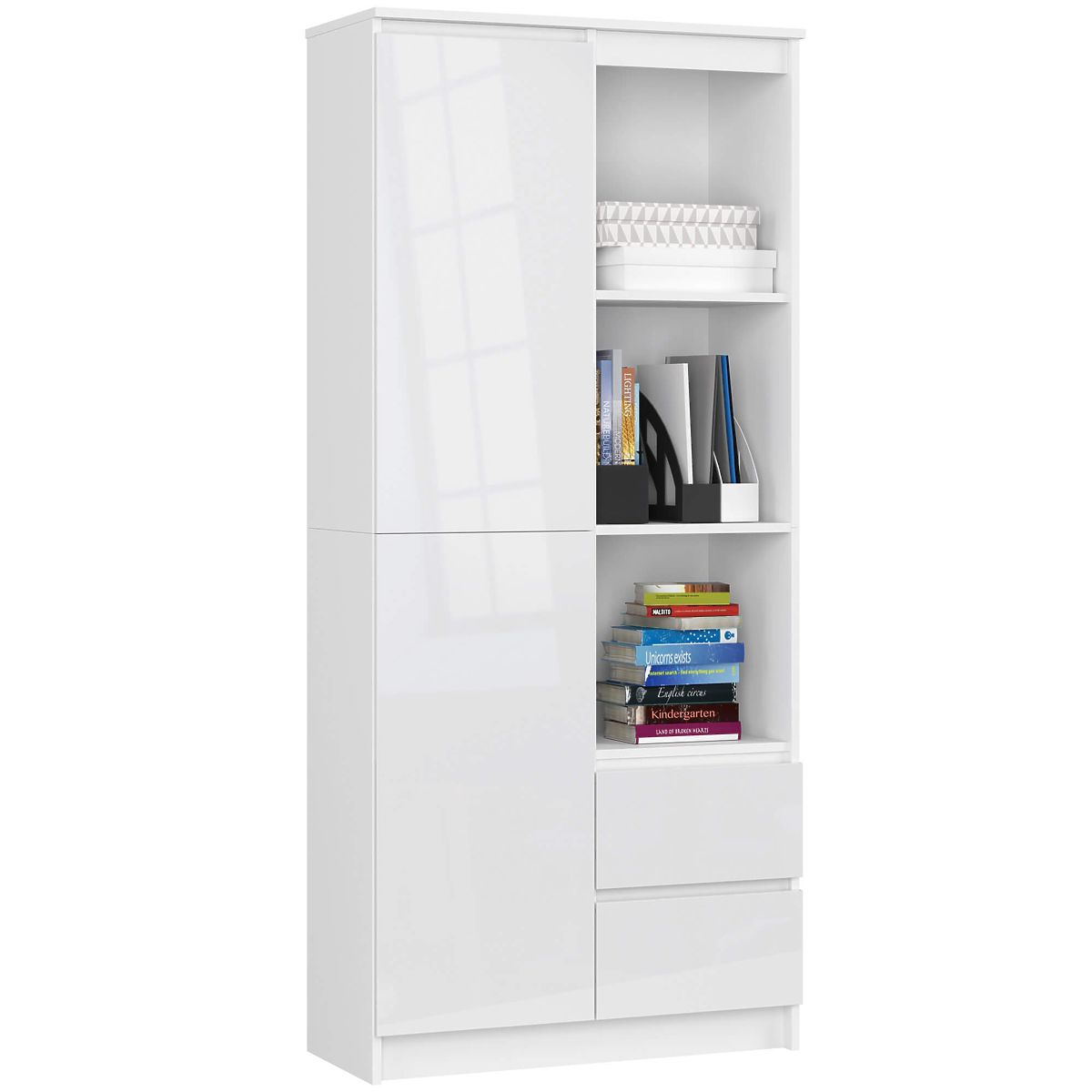 Regał biurowy z drzwiami i szufladami w kolorze białym z frontami w białym połysku.