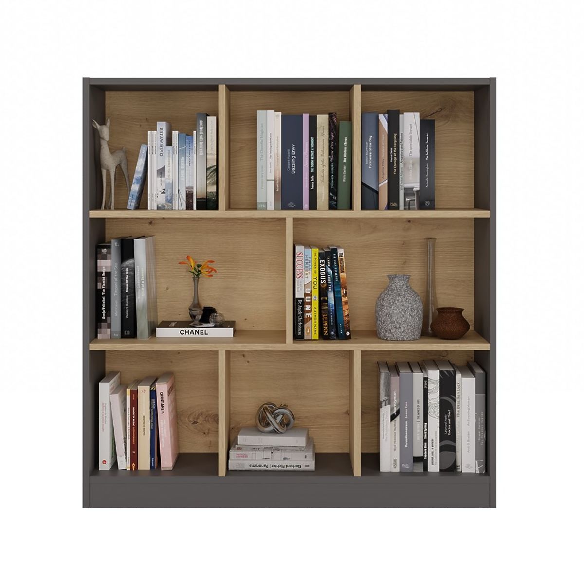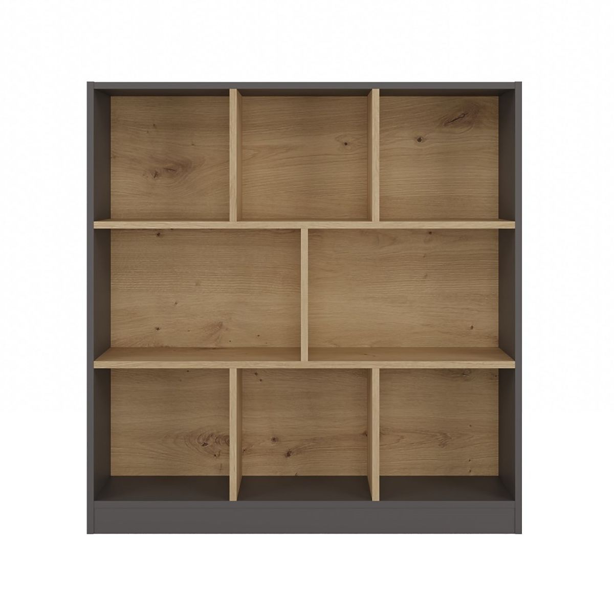 Dzięki 8 przestronnym i proporcjonalnie rozmieszczonym przegrodom, regał FIESTA 8P umożliwia estetyczne przechowywanie książek, dokumentów, ozdób czy pudełek. Dekoracyjna kombinacja głębokiego antracytu z ciepłym drewnem dębu artisan nadaje wnętrzu nowoczesny, a zarazem przytulny charakter.