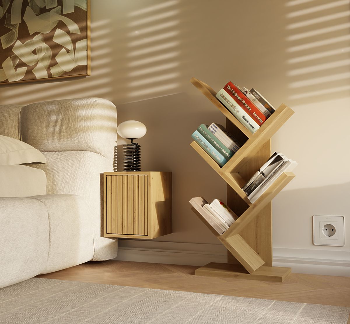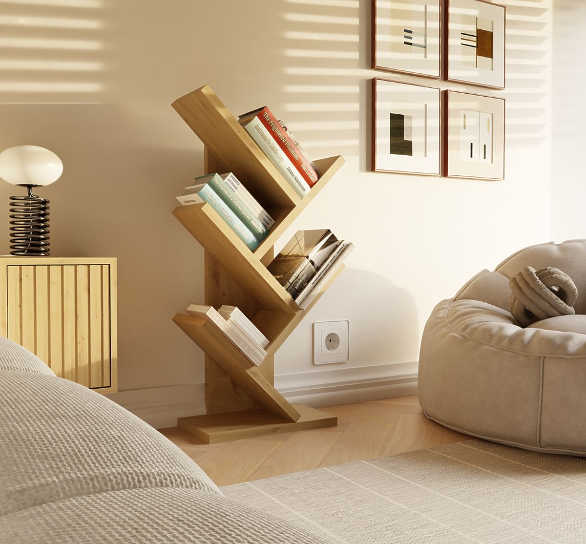 Regał Funny Mini to mniejsza wersja popularnego modelu Funny, stworzona z myślą o niewielkich przestrzeniach. Idealnie sprawdzi się w salonie, biurze, pokoju dziecięcym czy młodzieżowym. Dzięki oryginalnej, geometrycznej formie i skośnym półkom, pozwala na estetyczne i wygodne przechowywanie książek, czasopism, segregatorów, zabawek oraz drobnych przedmiotów.