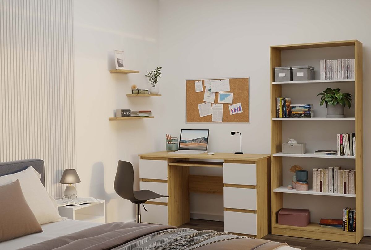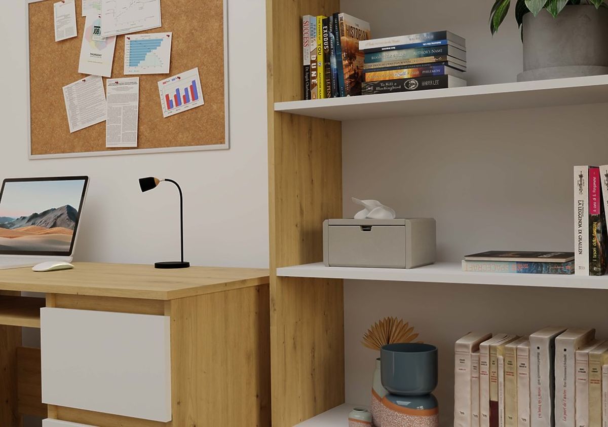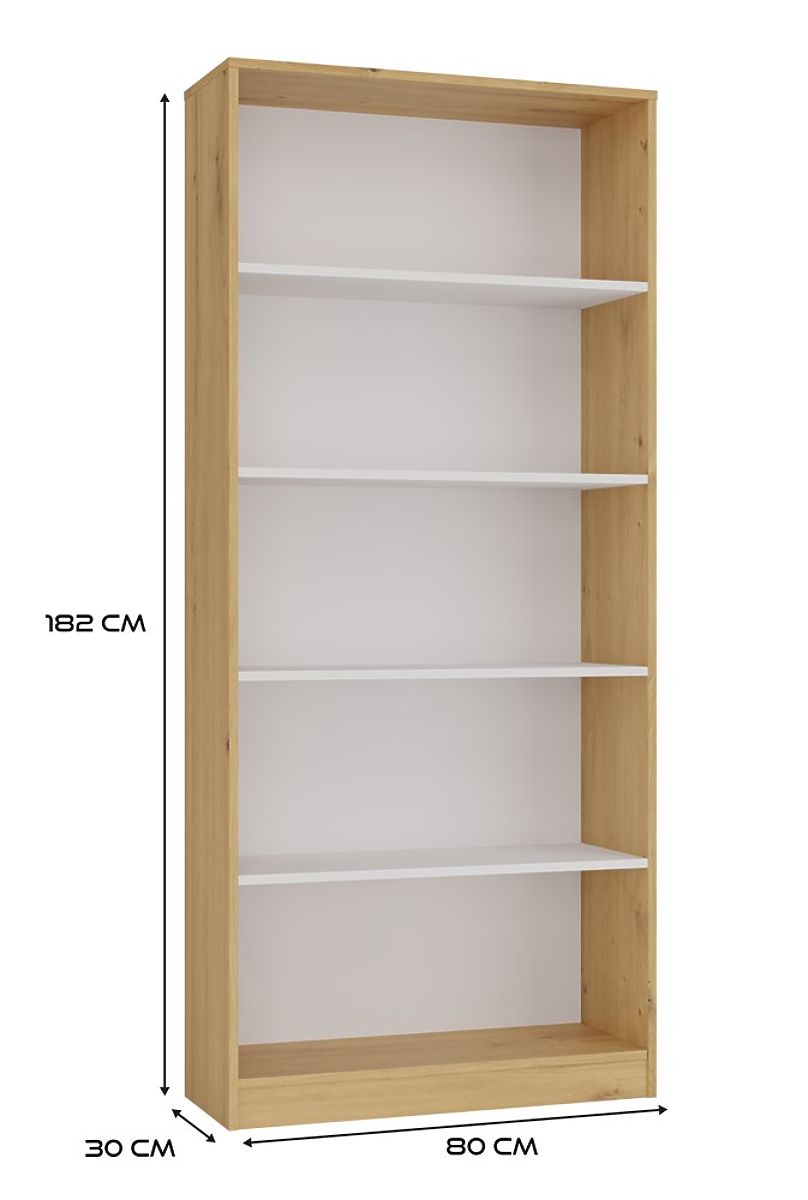 Regał R80 to stylowe i praktyczne rozwiązanie do przechowywania książek, segregatorów, dekoracji i materiałów biurowych. Połączenie ciepłego odcienia dębu artisan z kontrastującymi białymi półkami nadaje meblowi nowoczesny i elegancki charakter. Doskonale pasuje zarówno do biura, salonu, pokoju dziecięcego, jak i domowej biblioteki.