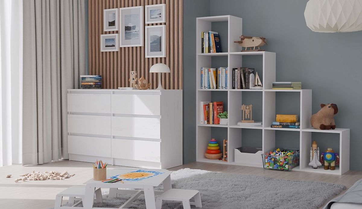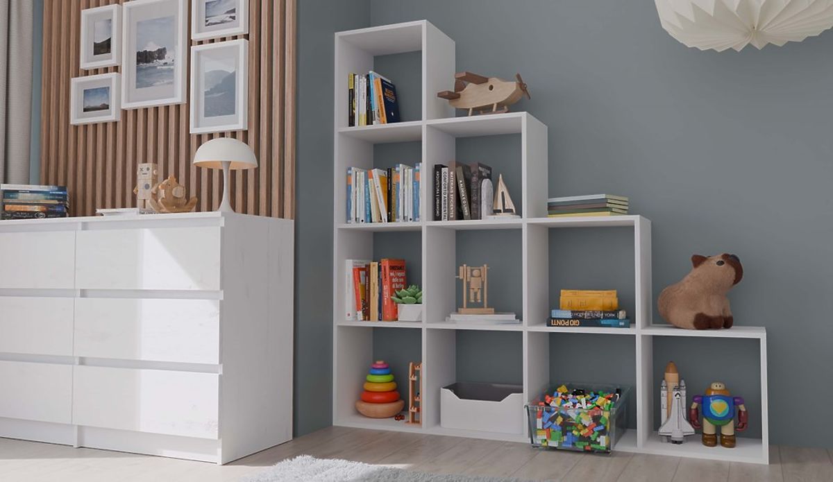 Przestronny regał umożliwia uporządkowanie przedmiotów w sypialni lub salonie.