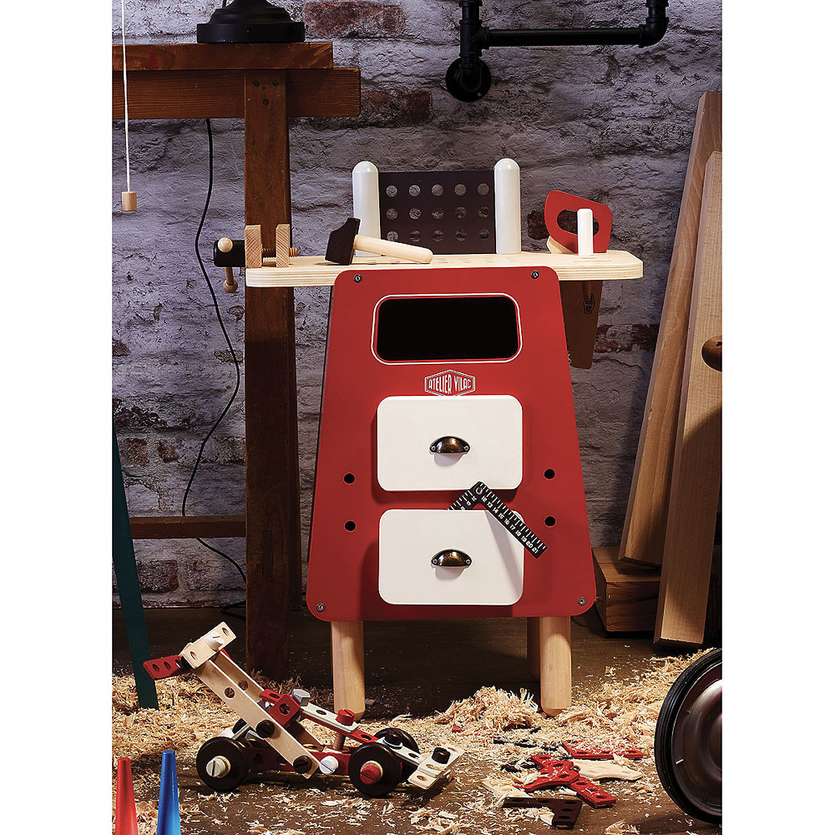 Ten oryginalny drewniany warsztat o wyglądzie vintage pozwala dzieciom tworzyć tak, jak to widzą u dorosłych. Magiczny blat roboczy, który trzyma się razem dzięki rzepowi, umożliwia dzieciom cięcie drewna bez ryzyka urazu. Młotkiem wbijają drewniane gwoździe dla dzieci. Śrubokrętem i kluczem montują i demontują rzeczy według własnego uznania. Wyobraźnia, cierpliwość i pomysłowość. Pozwól, aby talent najmłodszych zabłysnął! Dwustronna walizka z narzędziami od Atelier Vilac. Główne cechy: zawiera 76 elementów akcesoriów, projekt od Atelier Vilac, można złożyć 4 modułowe konstrukcje. Atelier Vilac. Buduj, odnawiaj, zrób to sam, jednym słowem... marzenie! Całkowicie nowa seria dla majsterkowiczów. Jakbyś naprawdę czuł zapach drewna, dotykał wiórów bukowych na podłodze warsztatu. Zanurz się z nami w tym kreatywnym świecie, który daje wolną rękę wyobraźni małych i dużych dzieci. Piękna kolekcja vintage z modułowymi i dodatkowymi zabawkami.