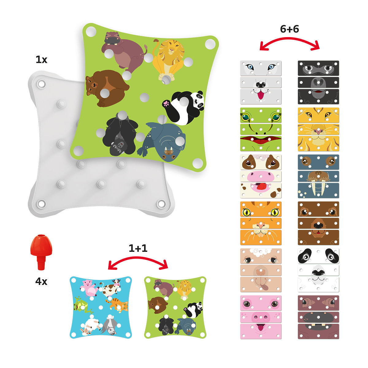 Całkowicie nowa gra rozwijająca percepcję wzrokową. Mnóstwo zwierzęcych twarzy do rozpoznania i następnie mieszania w nieskończonych wariacjach dla niekończącej się zabawy. Kompletny zestaw zwierzątek pomoże dziecku w rozpoznawaniu, a pomieszane twarze zwierząt rozwijają dziecięcą wyobraźnię. Zawartość opakowania: 1 podstawowa kartonowa dwustronnie ilustrowana karta, 6 perforowanych dwustronnie ilustrowanych puzzli, 1 plastikowa podstawa, 4 klipsy do mocowania podstawowej karty. Główne cechy: mnóstwo wariantów końcowych twarzy, wspiera wyobraźnię i kreatywność, odpowiednie dla dzieci od 3 lat