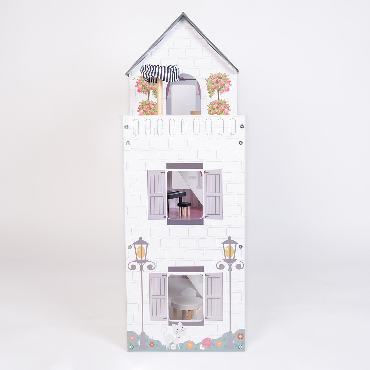 Ten trzypiętrowy dom ma cztery pokoje + taras . Wszystkie pomieszczenia doskonale imitują prawdziwy dom, dzięki czemu zabawa staje się bardziej realistyczna. Dzieci mogą na różne sposoby aranżować, przenosić lub dekorować dom. Świetne narzędzie do zabawy i nauki, rozwijające inspirację i wyobraźnię dzieci.