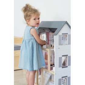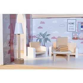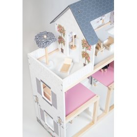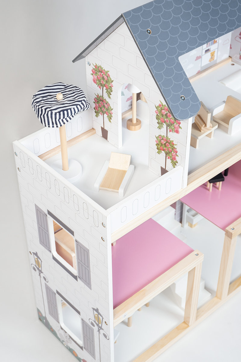Dom wykonany jest z drewna w delikatnych, naturalnych odcieniach. Wszystkie krawędzie są zaokrąglone, co zapewnia bezpieczeństwo podczas zabawy.