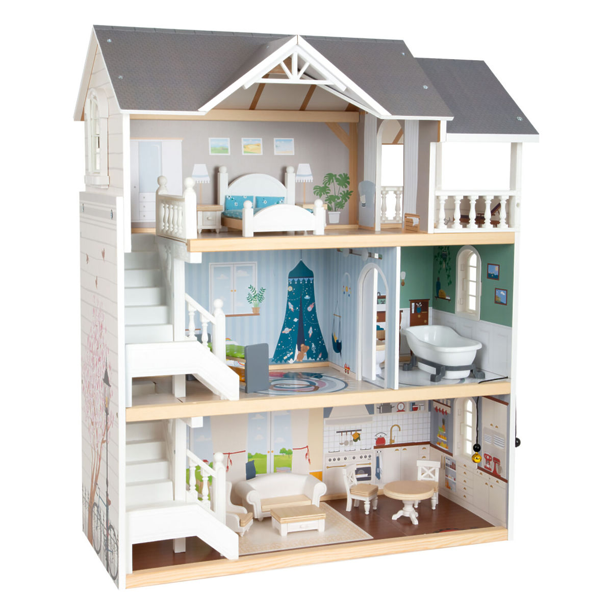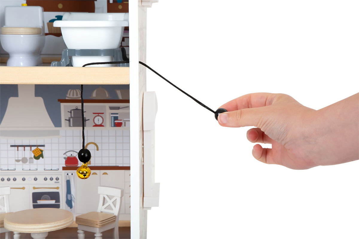 Jadalnia i salon, pokój dziecięcy i łazienka, a także sypialnia i loggia oferują mnóstwo miejsca do zabawy. Schody, przesuwne drzwi, otwierane okna, stoliki nocne z szufladami i prawdziwy dzwonek, który oznajmia przybycie gości, wraz z 12 elementami mebli i wieloma akcesoriami sprawiają, że zabawa jest doskonałą rozrywką. Otwarta przednia część ułatwia zabawę i pozwala kilku dzieciom bawić się lalkami jednocześnie. Produkt wymaga montażu, dostarczany z szczegółową instrukcją montażu. Duży, stabilny drewniany domek dla lalek z detalicznym designem wewnątrz i na zewnątrz domku. Otwarta przednia część ułatwia wspólną zabawę większej liczbie dzieci. 3 piętra połączone schodami, 5 pokoi i taras oferują przestrzeń do zabawy. Meble z drewnianymi detalami i plastikowymi elementami dla realistycznej zabawy. Funkcjonalny dzwonek i inne elementy jak przesuwne drzwi, otwierane okna, stolik nocny z szufladami. Główne cechy: Dzięki jasnej zewnętrznej fasadzie i nowoczesnemu designowi willa pasuje do każdego dziecięcego lub salonu. Wystarczająco duży dla wspólnej zabawy większej liczby dzieci. Funkcjonalny dzwonek i elementy mebli. Zawiera 12 sztuk mebli z akcesoriami. Odpowiedni dla lalek do wielkości 12 cm (np. LE11804). Nagrody zabawki: Top 10 Spielzeug Nominiert 2021