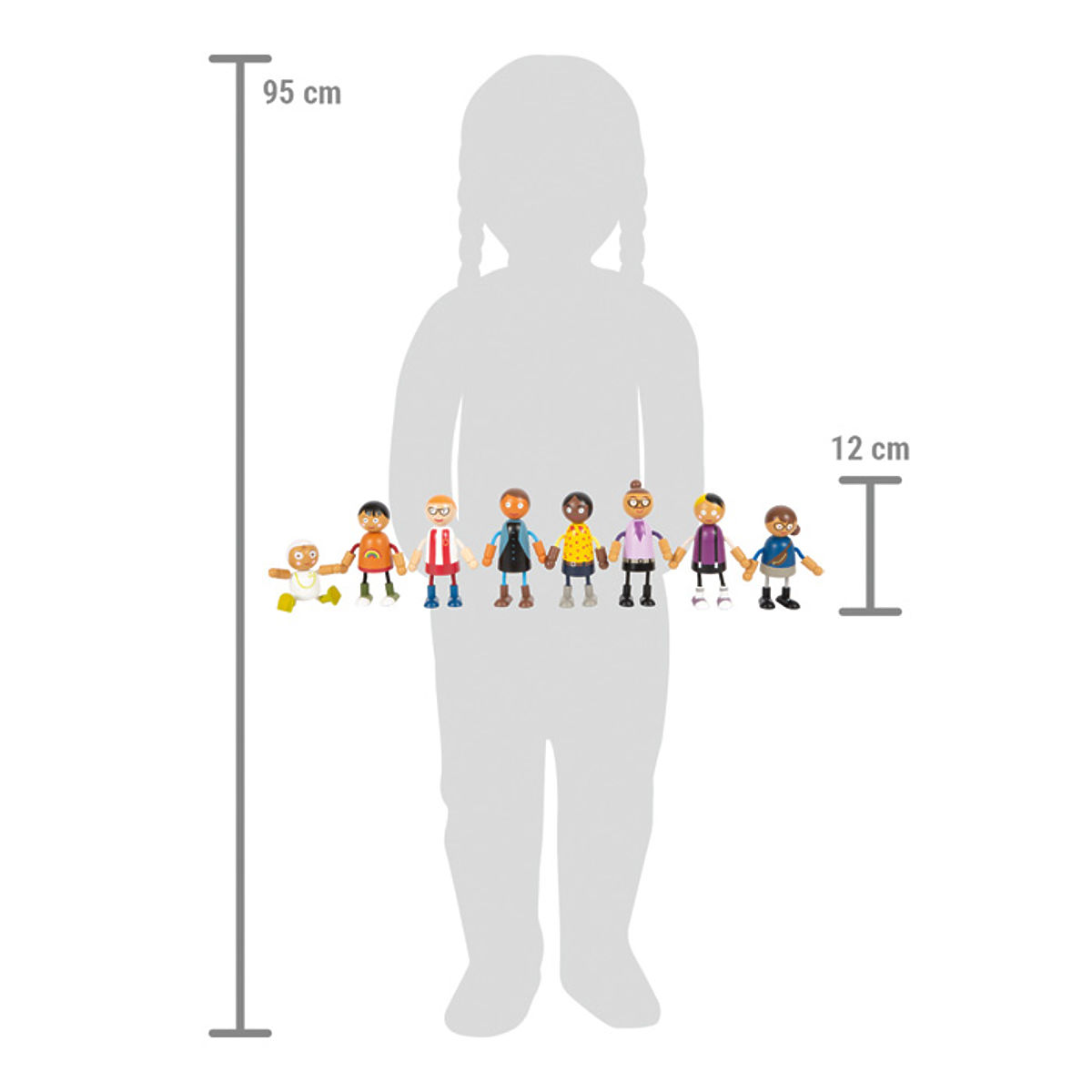 Ta duża rodzina drewnianych elastycznych lalek jest odpowiednia do każdego domku dla lalek. Składa się z 8 członków rodziny różnej płci i wieku. Elastyczne lalki mają głowy i ciała wykonane z litego drewna, podczas gdy ich ręce i nogi są tekstylne, elastyczne. Dwie pary rodziców, troje dzieci i niemowlę w nosidełku, które można przymocować do innych elastycznych lalek, oferują wiele różnych możliwości zabawy. Aktywna zabawa w role uczy dzieci w zabawny sposób, jak różnorodny może być styl życia. Zabawa w role wspiera rozwój identyfikacji, komunikacji, wyobraźni oraz umiejętności społecznych i emocjonalnych. Elastyczne lalki są łatwe do uchwycenia dla małych dziecięcych rączek. Idealny dodatek do miejskiej willi z domkiem dla lalek (11802) kompaktowej miejskiej willi (12277). Główne cechy: 8-członkowa elastyczna rodzina lalek wspiera wyobraźnię, kreatywność i umiejętności społeczne realistyczna zabawa dzięki elastycznym ramionom i nogom elastyczne, solidne z bogatymi detalami rozmiar figurki jest łatwy do uchwycenia dla dziecięcych rąk