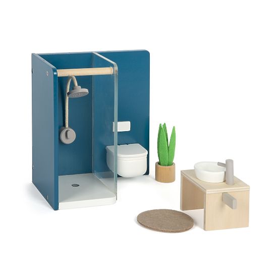 Zadbaj o przytulną i stylową łazienkę dla swoich lalek dzięki zestawowi mebli Small Foot! To wyposażenie łazienkowe jest nie tylko pięknym dodatkiem do domku dla lalek, ale także motywuje dzieci do kreatywnej zabawy i rozwija ich wyobraźnię. W zestawie znajduje się kabina prysznicowa z akrylową osłoną (wysokość prysznica jest regulowana), dywanik, wisząca toaleta i nowoczesna umywalka z małym ręcznikiem.