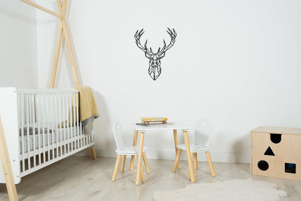 Drewniany obraz geometryczny w kształcie Jelenia 2. Wisząca dekoracja ze sklejki nadaje się do pokoju dziecięcego w stylu skandynawskim.