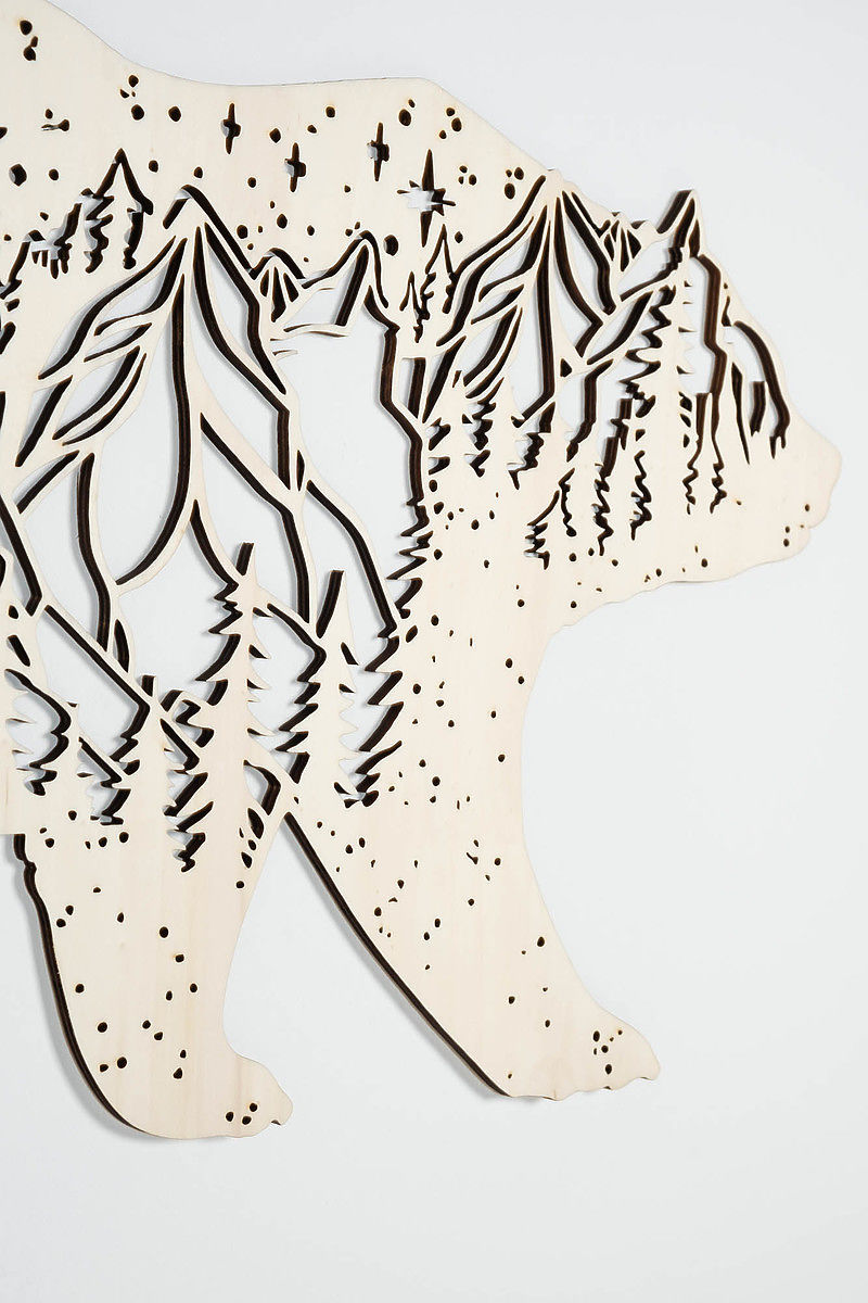 Drewniana figura geometryczna w kształcie misia. Wisząca dekoracja ze sklejki nadaje się do pokoju dziecięcego w stylu skandynawskim.