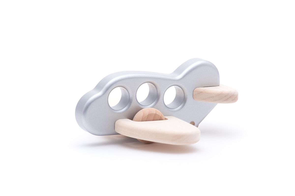 Drewniany szary samolot z uchwytem dla małej rączki. .. więcej