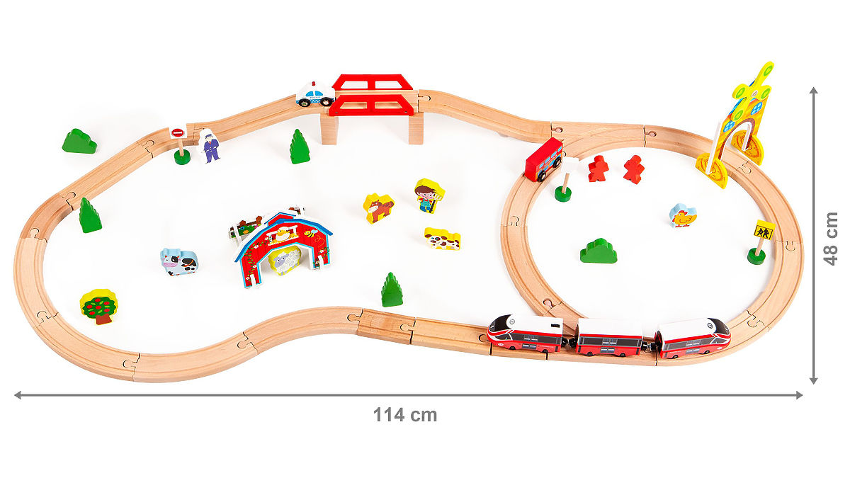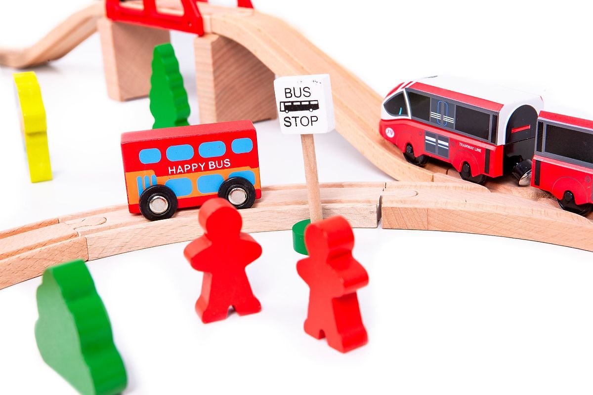 Zestaw pociągów z mnóstwem ciekawych akcesoriów oferuje miejsce na różne pomysłowe zabawy. Dzięki dużej ilości akcesoriów takich jak pojazdy, znaki drogowe i budynki, dziecko z zabawką może bawić się godzinami.