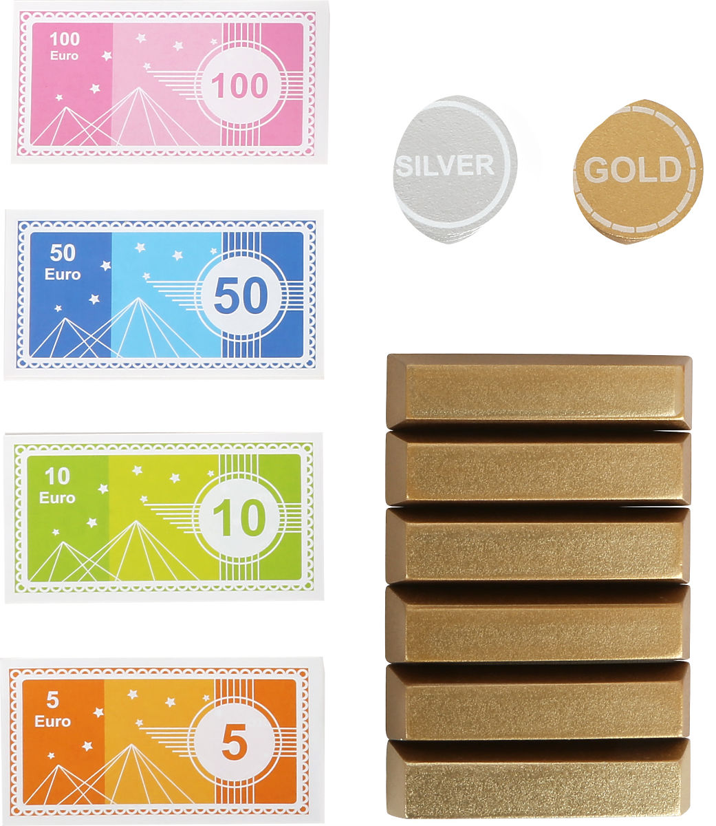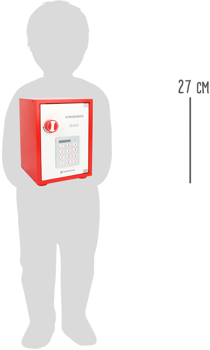 Bankierzy i złodzieje, uwaga! Ten drewniany sejf to naprawdę coś! Przy odpowiedniej kombinacji sejf otwiera się i ujawnia swoje tajemnice – banknoty euro, złote i srebrne monety, a także sztabki złota (wykonane z drewna). Obracający się zamek wydaje dźwięk, a przyciski można naciskać. Główne cechy: zawiera 68 elementów akcesoriów, obrotowy klikający cyferblat i przyciski do wprowadzania kodu, odpowiedni do zabawy w role lub przechowywania własnych drobnych skarbów.