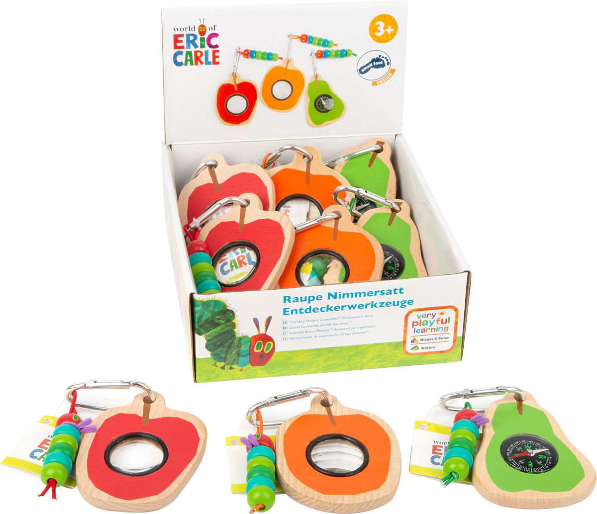 Zostań badaczem i odkrywaj świat z jednym z tych narzędzi badawczych Caterpillar z motywem głodnej gąsienicy. Kompas wskazuje, w którym kierunku poruszają się młodzi badacze, podczas gdy wszystko obserwują za pomocą lupy. Dzięki praktycznemu karabińczykowi można go przymocować do etui na pasku lub plecaku, więc nic nie zgubi się podczas odkrywczej podróży. Urocza drewniana zabawka jest absolutnym must-have dla każdego małego odkrywcy i skauta. Główne cechy: z wesołym motywem głodnej gąsienicy, można przymocować do etui na pasku lub plecaku, trwałe wykonanie.