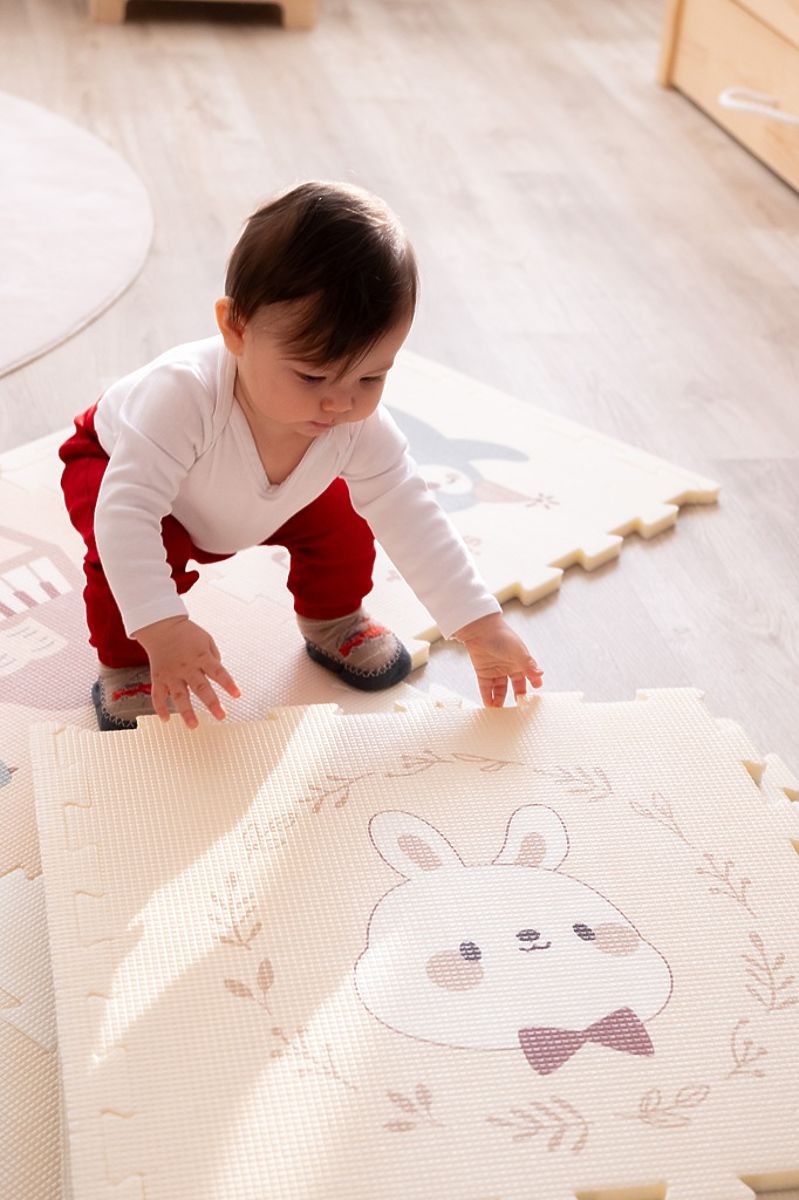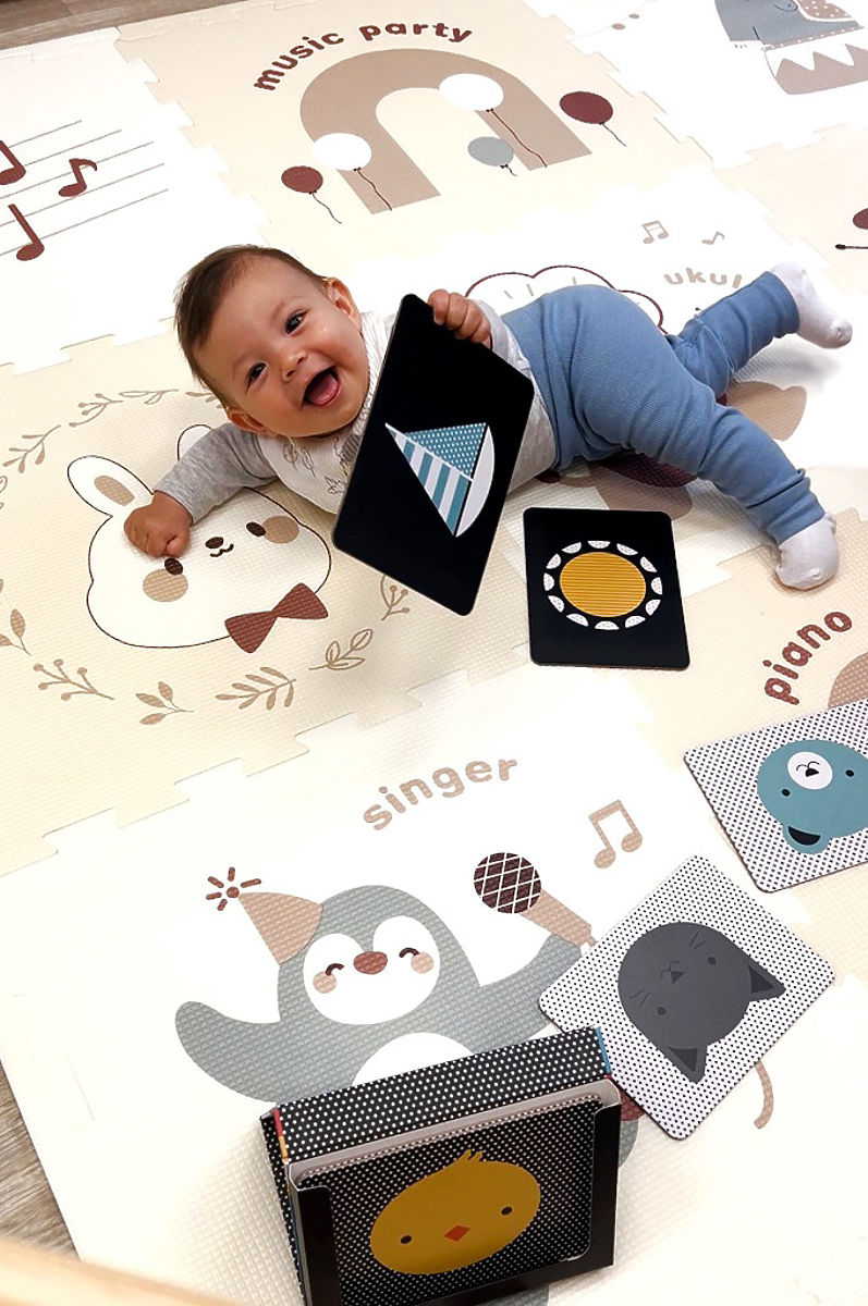 Mata piankowa do zabawy składa się z 9 kwadratów, które łatwo połączyć w praktyczną i wygodną powierzchnię do zabawy o wymiarach 180x180 cm. Mata wykonana jest z miękkiego i bezpiecznego materiału, który zapewnia dzieciom komfort i ochronę podczas zabawy na podłodze. Na poszczególnych elementach znajdują się urocze zwierzątka stylizowane na muzyków, otoczone motywami muzyki i nutami, które wspierają dziecięcą wyobraźnię i radość z odkrywania. Mata jest idealna do użytku domowego i pomaga rozwijać percepcję sensoryczną oraz kreatywność. Połączenie naturalnych tonów z białym kolorem oraz wysokiej jakości wykonanie sprawiają, że ta mata jest pięknym dodatkiem do każdego pokoju dziecięcego lub sali zabaw. Główne cechy: 9 kwadratów, miękki i bezpieczny materiał piankowy, łatwe łączenie poszczególnych elementów, motyw muzyki i zwierzątek jako muzyków, wspiera percepcję sensoryczną i kreatywność, odpowiednia dla dzieci od 6 miesięcy