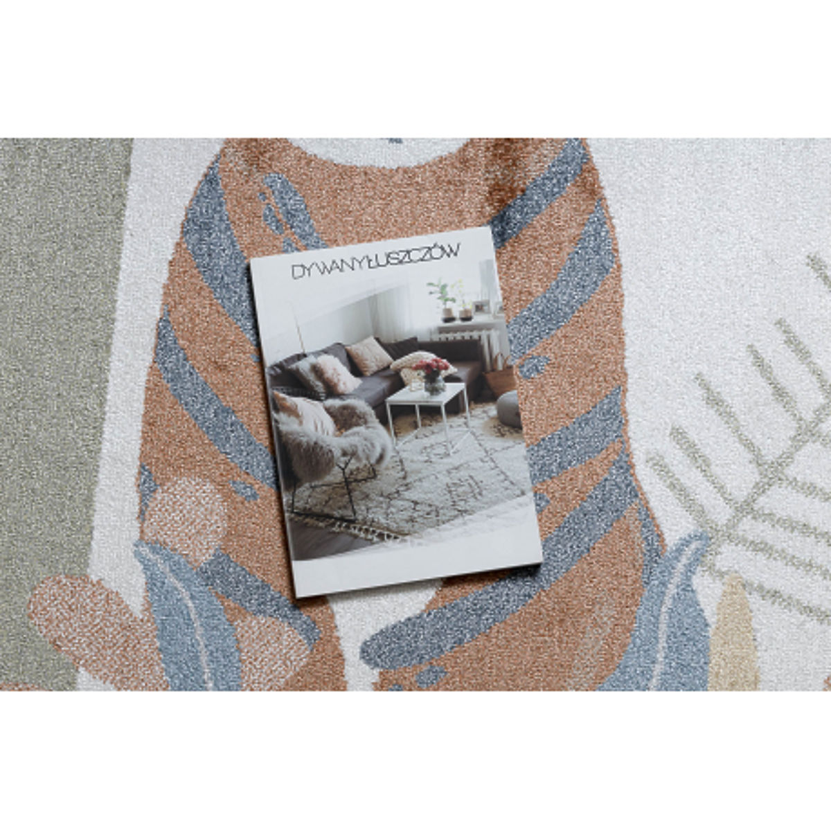 Prostokątny dywan BONO 8426 Jungle wnosi do dziecięcego pokoju egzotyczny i zabawny akcent. Kremowe tło w połączeniu z ciemnozłotymi detalami tworzy elegancki, a jednocześnie żywy wygląd, który pasuje do różnych wnętrz.