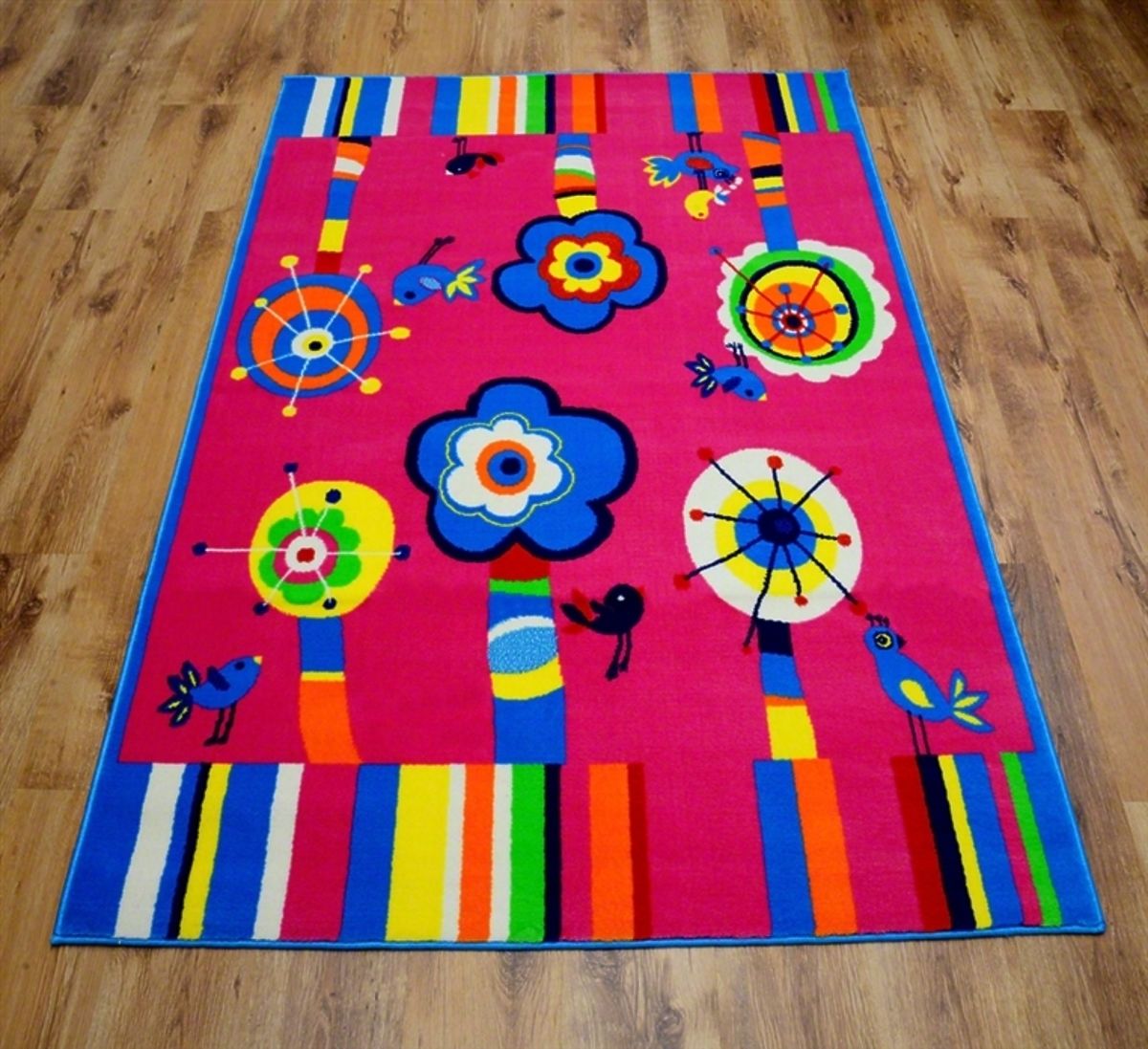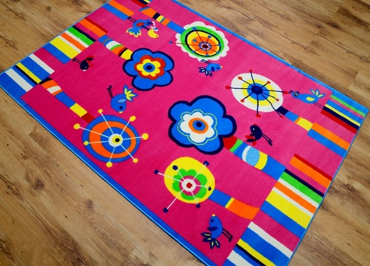 Wysokiej jakości dywan z motywem Wesołego Ogrodu ma żywe i nasycone kolory. Kwiatki i ptaszki rozweselą pokój każdej dziewczynki.
