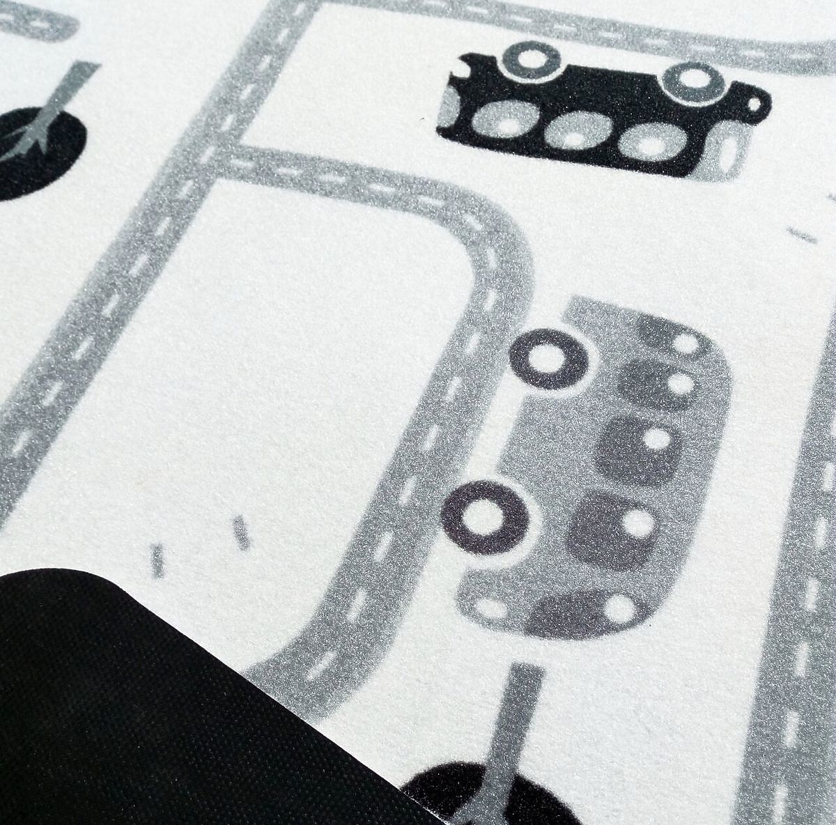 Luksusowy czarno-biały dywan z motywem drogi i samochodów, z niemieckiej firmy LIVONE, spodoba się każdemu członkowi rodziny.