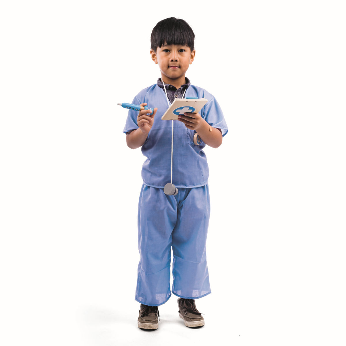 Pomóż dzieciom opiekować się misiami, lalkami lub członkami rodziny dzięki temu realistycznie wyglądającemu kostiumowi medyka dla dzieci. W skład tego stroju lekarskiego wchodzi niebieska koszulka, spodnie, drewniany stetoskop, teczka lekarska, w której dzieci mogą zapisywać notatki diagnostyczne, termometr, zegarek kieszonkowy, strzykawka oraz plastry. Rzepy ułatwiają zakładanie i zdejmowanie kostiumu. Kostium wykonany jest z bawełny i poliestru, można go prać w pralce. Główne cechy: doskonały do opieki nad chorymi misiami lub lalkami, pomaga w rozwoju wyobraźni, mowy i umiejętności społecznych, pomaga złagodzić strach i obawy przed wizytą u lekarza.