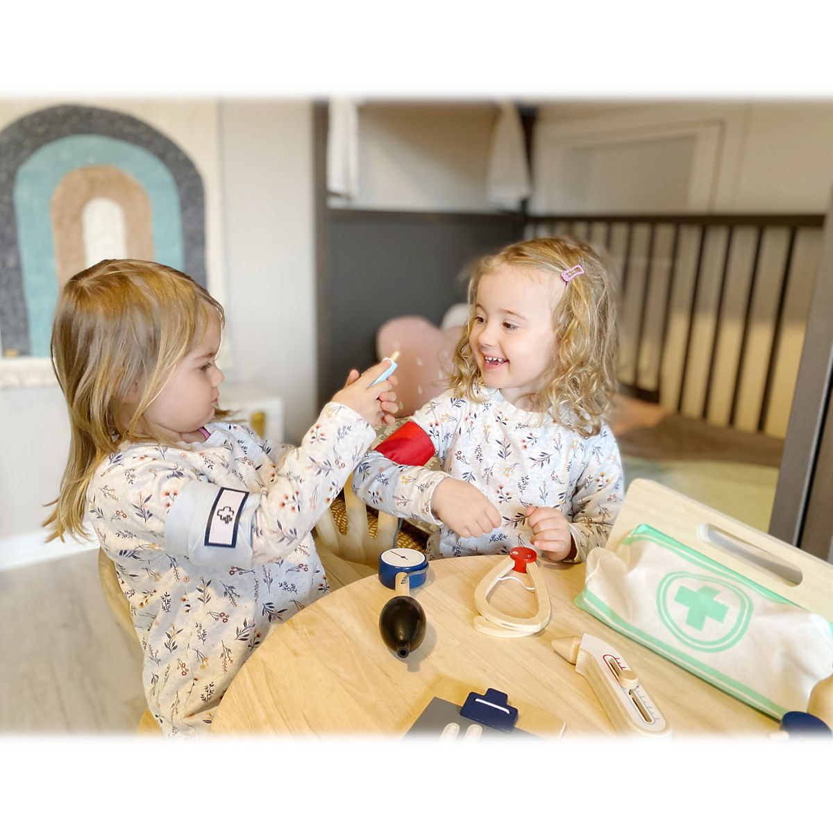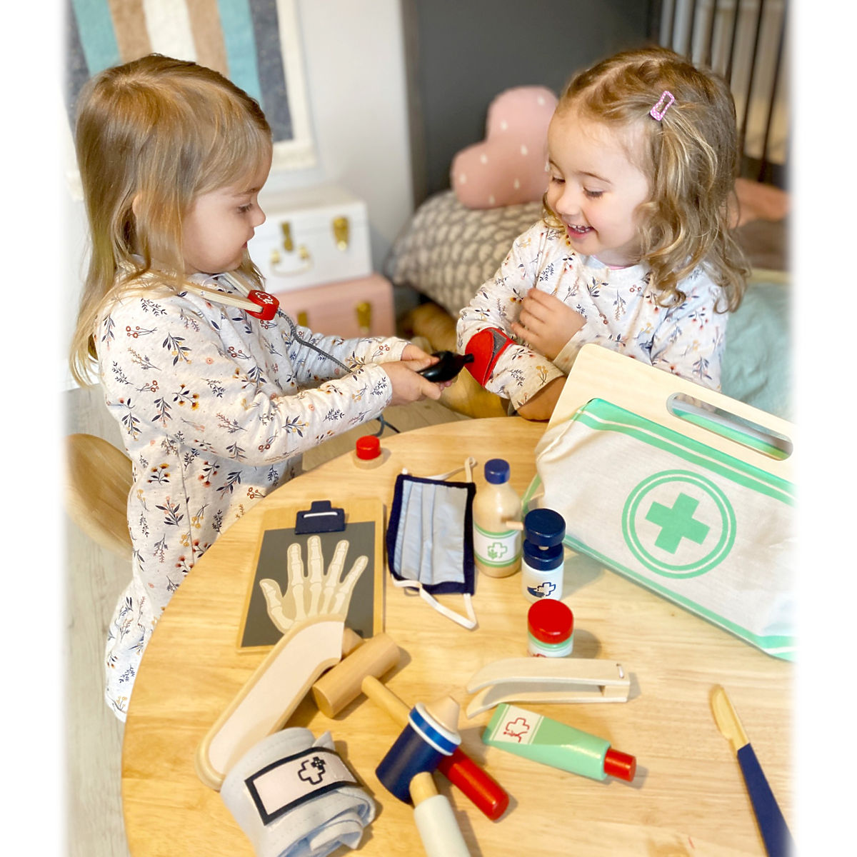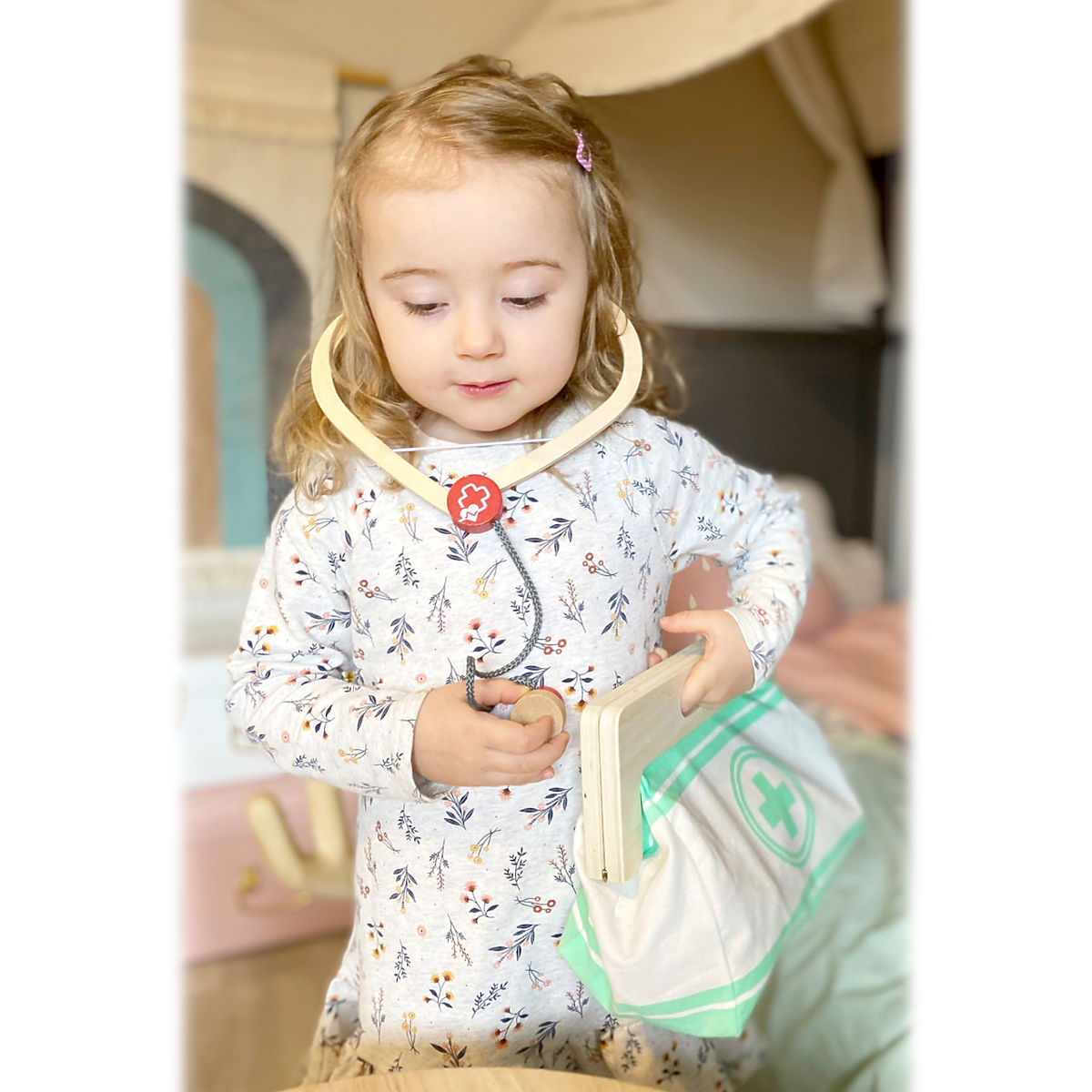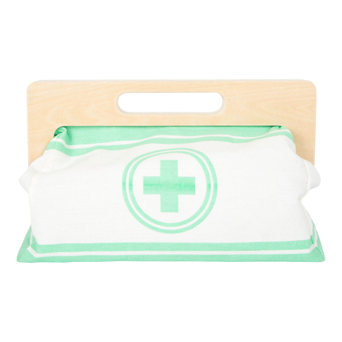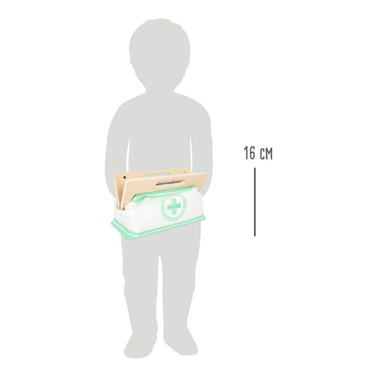 Z tą standardową torbą lekarską młodzi, obiecujący lekarze będą doskonale wyposażeni. Torba wykonana jest z miękkiego materiału, jest estetyczna i bardzo funkcjonalna. Można ją łatwo otworzyć dzięki magnesom, wykonana jest z drewna. Wewnątrz torby znajdziesz wszystko, co potrzebne do wyobrażonego leczenia pacjentów: stetoskop, termometr, strzykawkę i wiele więcej – wszystko wykonane z solidnego drewna! Najlepszymi dodatkami są ciśnieniomierz z mankietem i balonikiem oraz otoskop z lupą. Ten obszerny zestaw zabawek lekarskich zawiera wiele „prawdziwych” narzędzi i przyrządów medycznych, które zapewnią dzieciom wspaniałą zabawę. Ilustracje na przyborach lekarskich pomogą dzieciom rozpoznać narzędzia i mogą ułatwić ich użycie. Główne cechy: Torba lekarska z wyraźnie widocznym drewnemCiśnieniomierz z mankietem i balonikiemTermometr z regulowaną temperaturąOtoskop z prawdziwą lupąButelka na leki z zakręcanym wieczkiemPlastry na rzepyWielokrotnego użytku i zmywalne dziecięce maski tekstylneDodatkowe wyposażenie: strzykawka z ruchomym mechanizmem, stetoskop, dezynfekcja z pompką, butelka z lekami i łyżeczka, pęseta, skalpel, młotek refleksyjny