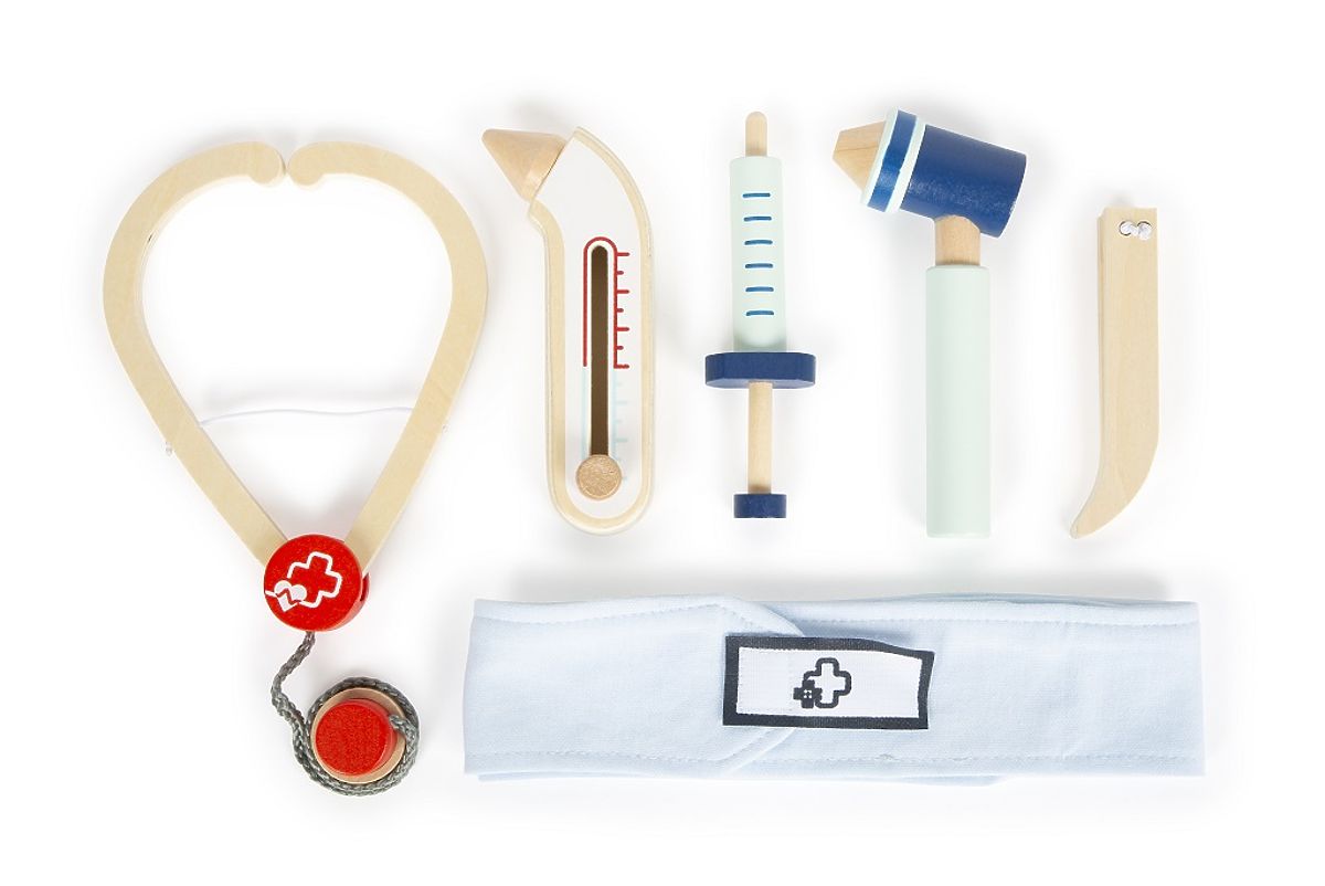 Zanurz się w ekscytujący świat prawdziwej medycyny! Ten 6-częściowy zestaw zawiera wszystko, czego potrzebują młodzi lekarze. Z zestawem lekarskim łatwo wyleczysz wszystkie chore pluszaki i lalki! Zestaw wykonany jest z solidnego drewna. Strzykawka, termometr, otoskop, pęseta, bandaż i stetoskop to niezbędne elementy w każdym domu małych lekarzy. Ten zestaw do zabawy w aktywny sposób inspiruje wyobraźnię i kreatywność młodych medyków. Główne cechy: 6-częściowy zestaw, strzykawka z ruchomym tłokiem, otoskop z prawdziwą lupą, termometr z regulowanym wskaźnikiem temperatury, bandaż na rzepy, solidne i trwałe wykonanie z litego drewna.