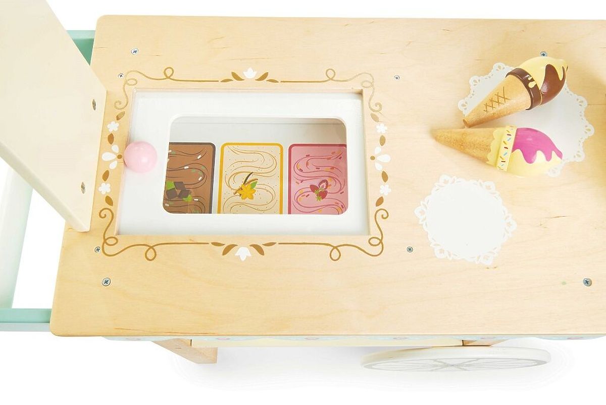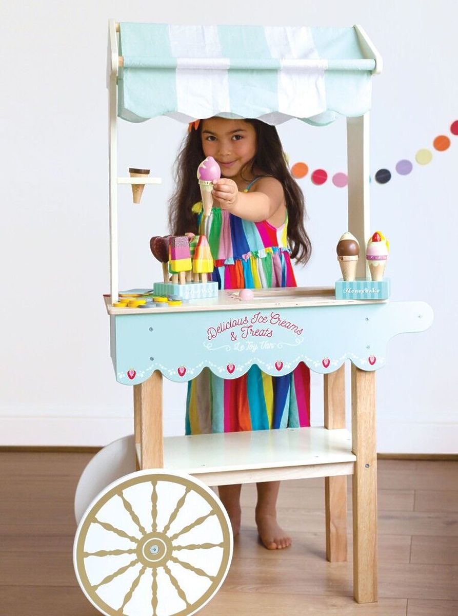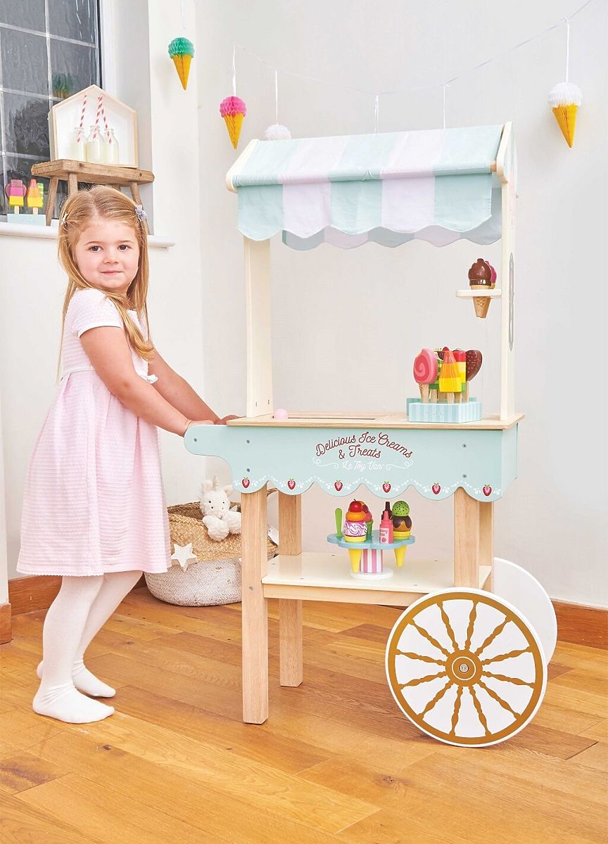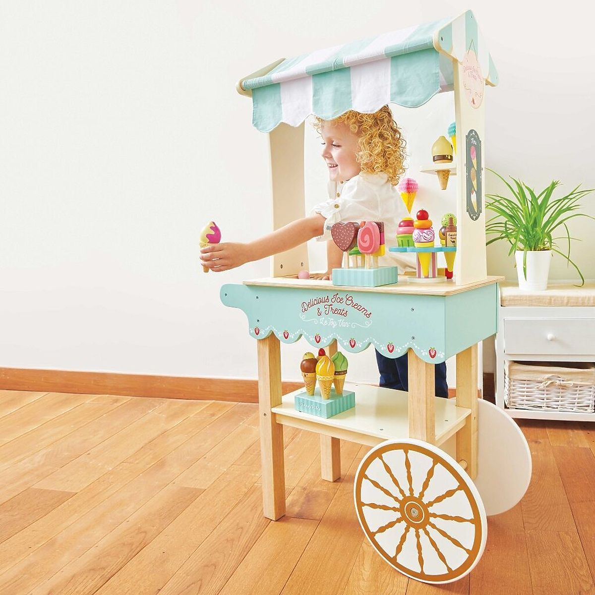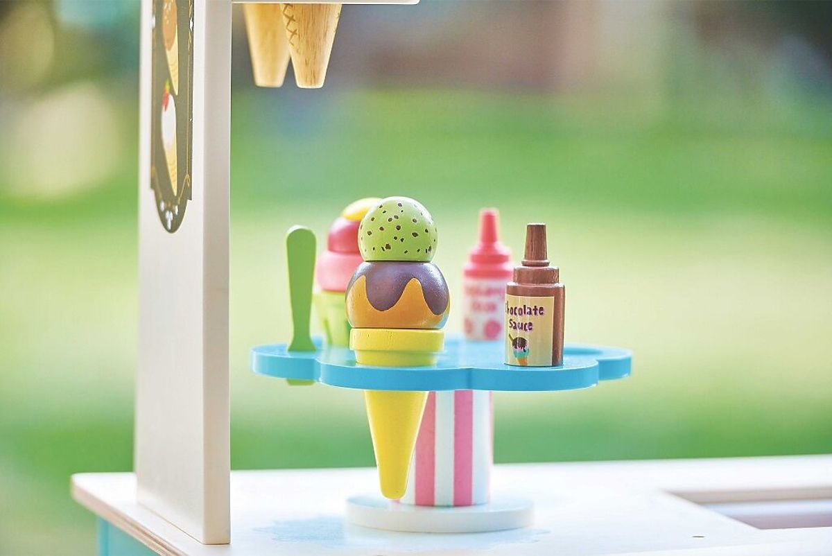 Letnie orzeźwienie! Ze stylowym wózkiem z lodami, który obecnie jest naprawdę rzadko spotykany, dzieci mogą bawić się w lodziarzy i lodziarki. Retro wózek z lodami jest idealny do zabawy w pokoju dziecięcym i w ogrodzie. Klasyczny pasiasty materiałowy baldachim, pastelowe kolory i złote detale - ta naprawdę wyjątkowa zabawka jest wykonana z trwałego drewna i zaprojektowana tak, aby przetrwać wiele lat kreatywnej zabawy. Ma wiele realistycznych funkcji, które dzieci mogą odkrywać podczas zabawy. Przegródka na lód z przesuwanymi drzwiami, które odsłaniają ilustracje klasycznych smaków lodów, dwa magnetyczne rożki do lodów, ruchome kółka, dzięki którym będą mogły serwować lody gdziekolwiek. Zabawki z celemWszystkie zabawki firmy Le Toy Van są tworzone z myślą o długowieczności. Projektowane z miłością przez doświadczonych rzemieślników przy użyciu etycznych praktyk i trwałych materiałów, które są przyjazne dla naszej planety. Główne cechy: wykonane etycznie z trwałego drewna, testowane zgodnie z najsurowszymi standardami, malowane nietoksycznymi farbami na bazie wody, inspirują do kreatywnej zabawy, odpowiednie do zabawy w role, zabawka zdobyła nagrody Nagrody zabawki: Right Start Top Investment Award 2019, Right Start Winner 2019, Good Toy Guide Recommended Kolekcja Honeybake: Zabawki w tej kolekcji są odpowiednie do odkrywania, pomagają dzieciom rozwijać wyobraźnię, umiejętności społeczne i werbalne oraz funkcje poznawcze. Tradycyjny design z nowoczesnymi detalami z pewnością spodoba się dzieciom. Honeybake to kolekcja Le Toy Van, która zdobyła najwięcej nagród za design, jakość, bezpieczeństwo oraz wartość edukacyjną i zabawową.