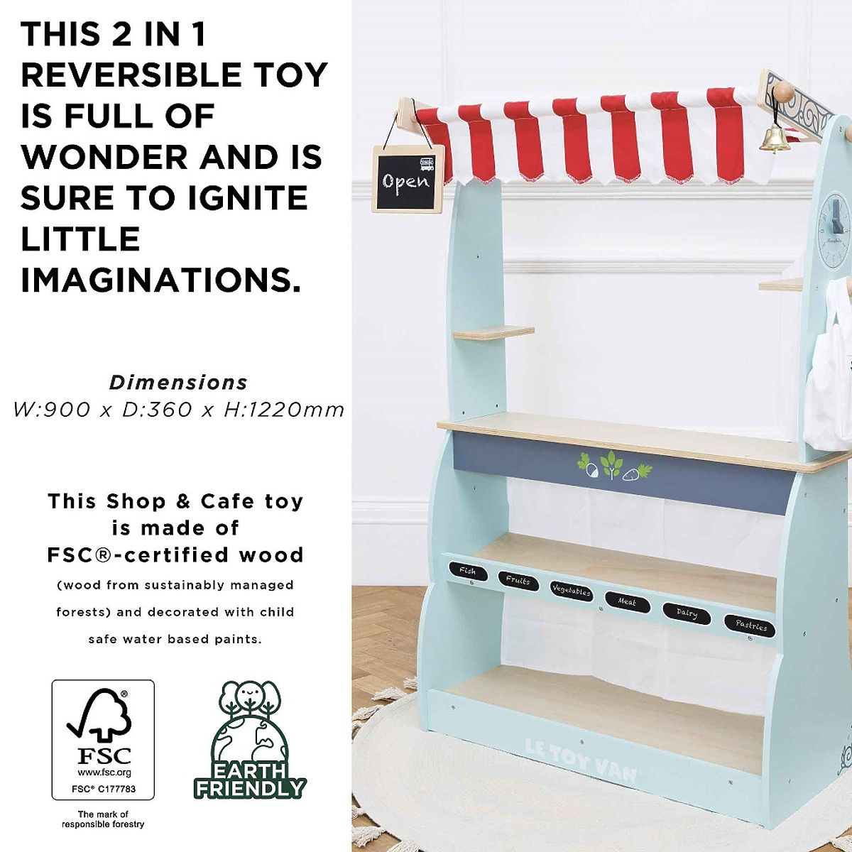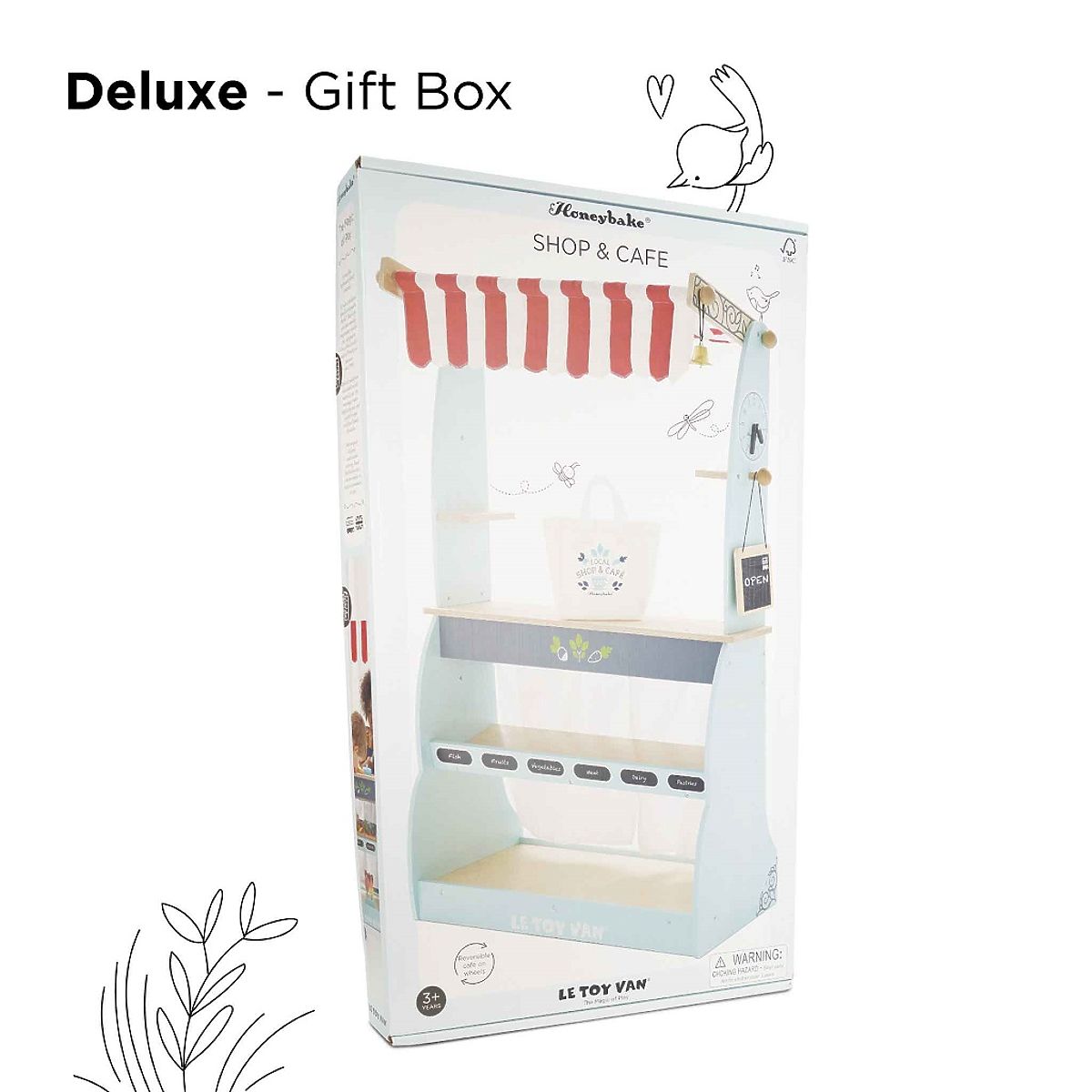 Wspaniałe i uwielbiane przez wszystkich drewniane stoisko zdobyło kilka nagród! Dzieci mogą używać go jako sklep lub kawiarnię, wszystko zależy od ich wyobraźni. Stoisko 2 w 1 wystarczy obrócić, z jednej strony ma półki na produkty, a z drugiej przestrzeń do przygotowywania i serwowania gorących napojów. Nie brakuje także dwustronnej tablicy na kredę, tekstylnej torby na zakupy i dzwoneczka. Dzieci podczas zabawy rozwijają nie tylko umiejętności społeczne. Można łączyć z zestawami jedzenia od Le Toy Van. Zabawki z celemWszystkie zabawki firmy Le Toy Van są tworzone z myślą o trwałości. Projektowane z miłością przez doświadczonych rzemieślników z użyciem etycznych praktyk i zrównoważonych materiałów, które są przyjazne dla naszej planety. Główne cechy: wykonane etycznie z zrównoważonego drewna testowane zgodnie z najsurowszymi standardami malowane nietoksycznymi farbami na bazie wody inspiruje do kreatywnej zabawy rozwija umiejętności poznawcze kółka dla łatwego transportu Nagrody zabawki: Junior Design Bronze Award 2017 Good Toy Guide Recommended Right Start Best Toy Award Winner 2017 Kolekcja Honeybake: Zabawki z tej kolekcji są odpowiednie do odkrywania, pomagają dzieciom rozwijać wyobraźnię, umiejętności społeczne i werbalne oraz funkcje poznawcze. Tradycyjny design z nowoczesnymi detalami z pewnością spodoba się dzieciom. Honeybake to kolekcja Le Toy Van, która zdobyła najwięcej nagród za design, jakość, bezpieczeństwo oraz wartość edukacyjną i zabawową.