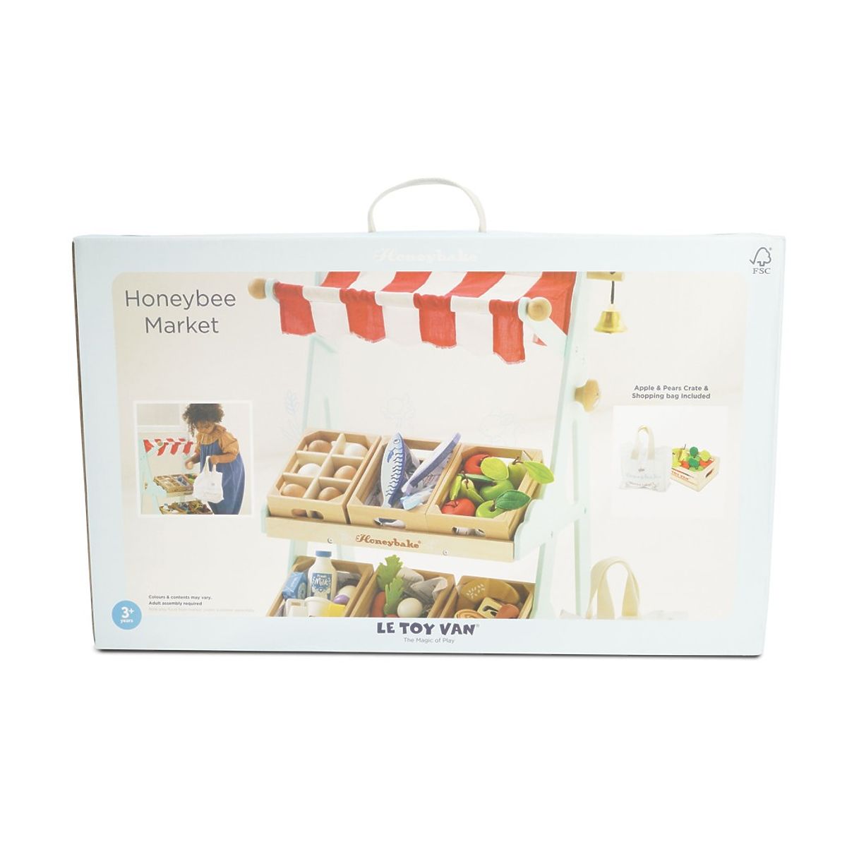 Stoisko sprzedażowe jest jednym z ulubionych produktów Le Toy Van, co nie jest zaskoczeniem, że zdobyło kilka nagród. Zaprojektowane przez utalentowanych projektantów do codziennej zabawy w odgrywanie ról. W zestawie znajduje się torba na zakupy oraz skrzynka z jabłkami i gruszkami. Na półkach można umieścić także inne skrzynki z jedzeniem od Le Toy Van. Na górze znajduje się ładny baldachim, z boku dzwoneczek, którym klienci mogą zwrócić uwagę sprzedawców. Zabawka pomaga dzieciom rozwijać umiejętności społeczne i językowe, a także uczy cierpliwości. Zabawki z celem Wszystkie zabawki firmy Le Toy Van są stworzone z myślą o trwałości. Projektowane z miłością przez doświadczonych rzemieślników z użyciem etycznych praktyk i zrównoważonych materiałów, które są przyjaźniejsze dla naszej planety. Główne cechy: wykonane etycznie z drewna FSC zrównoważonego testowane zgodnie z najwyższymi standardami malowane nietoksycznymi farbami na bazie wody inspiruje do kreatywnej zabawy rozwija umiejętności poznawcze Nagrody zabawki: Grand Prix De La Presse Award 2012 Kolekcja Honeybake: Zabawki z tej kolekcji są idealne do odkrywania, pomagają dzieciom rozwijać wyobraźnię. Tradycyjny design z nowoczesnymi detalami z pewnością przypadnie dzieciom do gustu. Honeybake to kolekcja Le Toy Van, która zdobyła najwięcej nagród za design, jakość, bezpieczeństwo oraz wartość edukacyjną i zabawową.