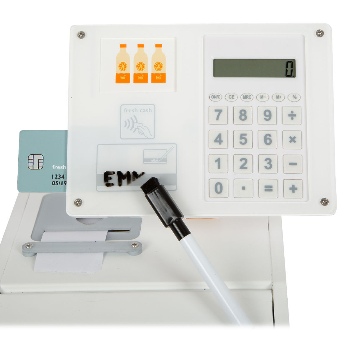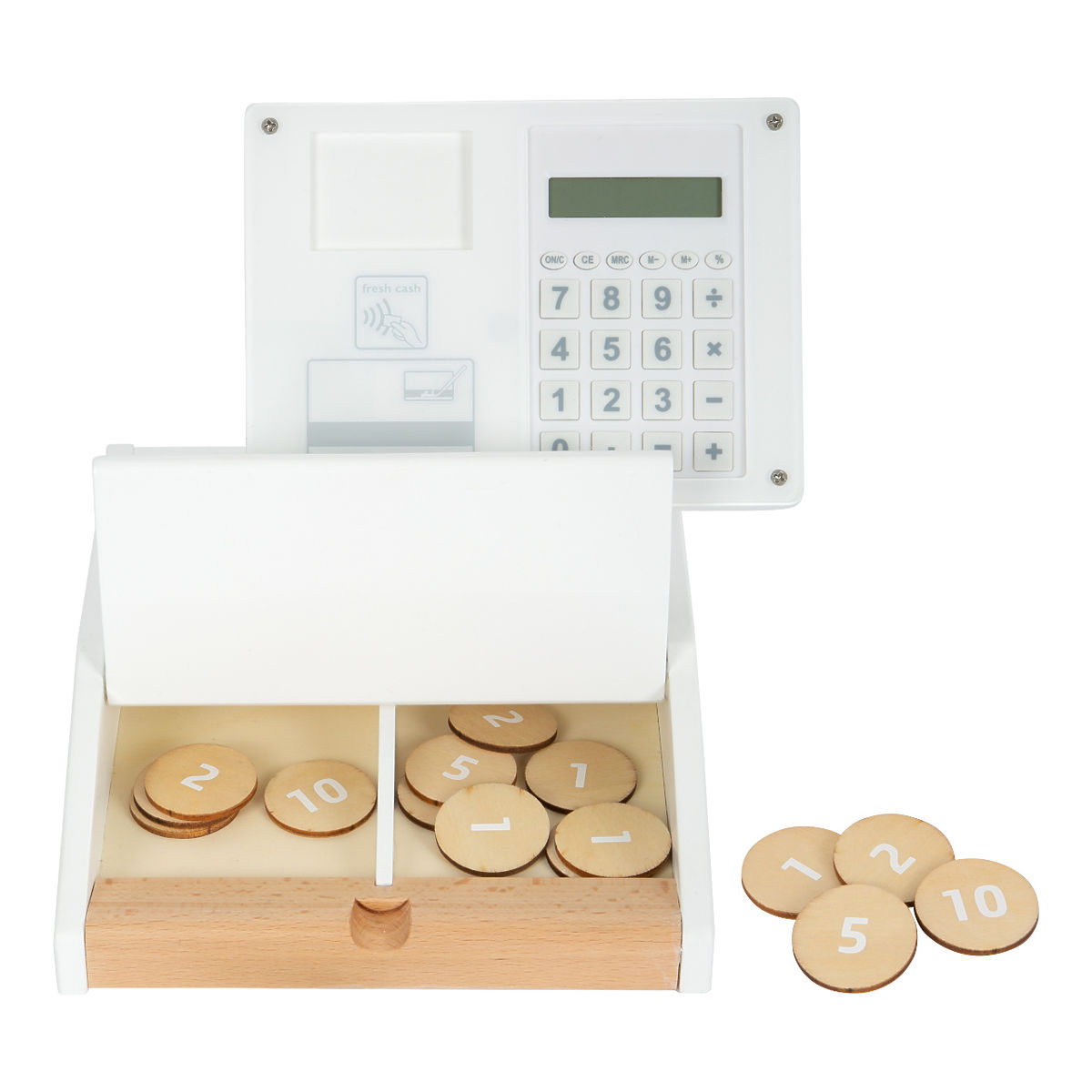 Piękna i nowoczesna kasa z drewna doskonale sprawdzi się w dziecięcych stoiskach sprzedażowych. Posiada realistyczne akcesoria i zabawne funkcje. W zestawie znajdziesz czytnik kodów kreskowych, rolkę paragonów, monitor, skaner, kartę debetową, karty produktów oraz dwustronne drewniane monety. Dodatkowo, działający kalkulator zintegrowany z monitorem, otwierana szuflada kasy z dwoma przegródkami, jak w prawdziwym supermarkecie. Mazakiem do ścierania podpisz się na plexi przy płatności kartą. Baterie nie są dołączone do zestawu. Chcesz płacić jak w prawdziwym supermarkecie? W takim razie ta kasa jest właśnie dla Ciebie. Zagraj w sklep bezpośrednio w domu, naucz się używać pieniędzy, popraw swoje umiejętności liczenia, przy dużych zakupach możesz użyć kalkulatora. Wysokiej jakości kasa z solidnego drewna ucieszy wszystkich małych sprzedawców. Główne cechy: czytnik kodów kreskowych, rolka paragonów, obrotowy monitor, działający kalkulator, karta płatnicza, karty produktów, 15 dwustronnych drewnianych monet, duża szuflada kasy, którą można otworzyć, karty produktów są dwustronne, można je wsunąć na górną część monitora, mazak do ścierania pozwala na podpisywanie się na plexi przy płatności kartą, dzieci ćwiczą matematykę przy liczeniu pieniędzy i produktów, kompatybilna z innymi produktami z serii „Fresh”, prosty i nowoczesny nordycki design z widocznym drewnem.