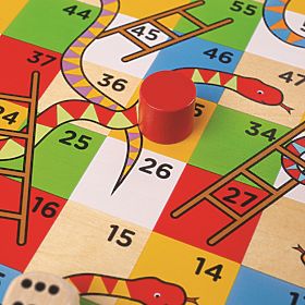 Snakes and Ladders, tradycyjna gra planszowa uwielbiana przez rodziny na całym świecie. Z gry może korzystać do 4 graczy jednocześnie. Ten zestaw zawiera wszystko, czego potrzebujesz do wielogodzinnej rywalizacji, w tym kości i 4 kolorowe żetony. Ta kolorowa, drewniana gra planszowa Węże i drabiny to świetny sposób na rozwinięcie podstawowych umiejętności matematycznych, takich jak liczenie, dodawanie i odejmowanie. Jak grać w grę: Każdy gracz wybiera kolorowy pionek i umieszcza go na planszy pod numerem 1. Gra rozpoczyna się od najmłodszego gracza, następnie gra toczy się zgodnie z ruchem wskazówek zegara.Gracz rzuca kośćmi i porusza się po planszy zgodnie z liczba punktów wyrzuconych na kostkach. Jeśli gracz kończy turę na początku drabiny, przesuwa się po drabinie na planszy na szczyt drabiny. Jeśli gracz zakończy ruch na głowie węża, zsunie się on w dół do końca ogona.Wygrywa gracz, który jako pierwszy osiągnie liczbę 100.Główne cechy: wykonany z wysokiej jakości materiałów, spełnia aktualne europejskie normy bezpieczeństwa