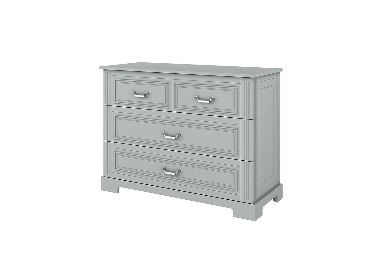 Ponadczasowa romantyczna szeroka komoda z czterema szufladami z kolekcji Ines Grey w klasycznym stylu sprawdzi się w pokoju dziecięcym, sypialni czy innym .. więcej