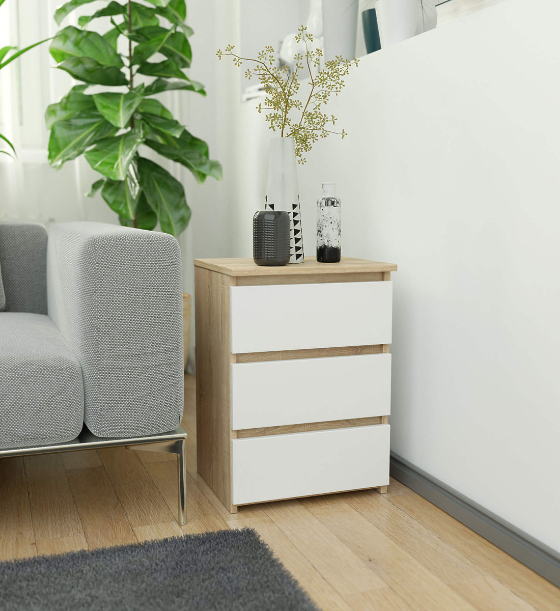 Szafka nocna CL3 40 cm z trzema szufladami w kolorze dąb sonoma i białym. .. więcej