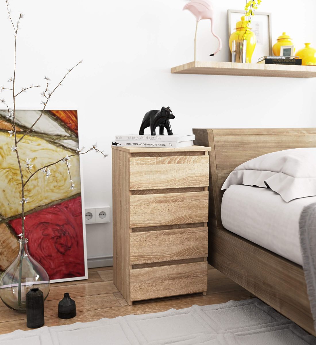 Komody są popularnym typem mebli, które umieszcza się obok łóżka. Na blacie najczęściej znajduje się lampka, a wewnątrz przedmioty ułatwiające odpoczynek i sen. Osoby poszukujące eleganckiej komody powinny zwrócić uwagę na komodę CL4 40 cm w kolorze dąb sonoma. Będzie się pięknie prezentować w każdej sypialni. Można ją również umieścić w pokoju dziecięcym.
