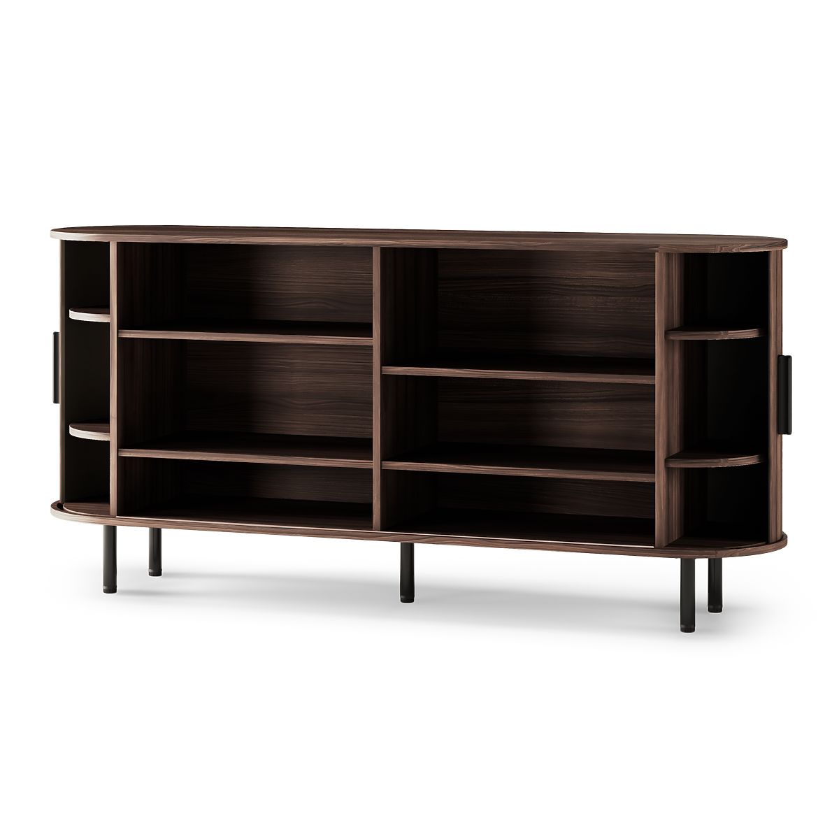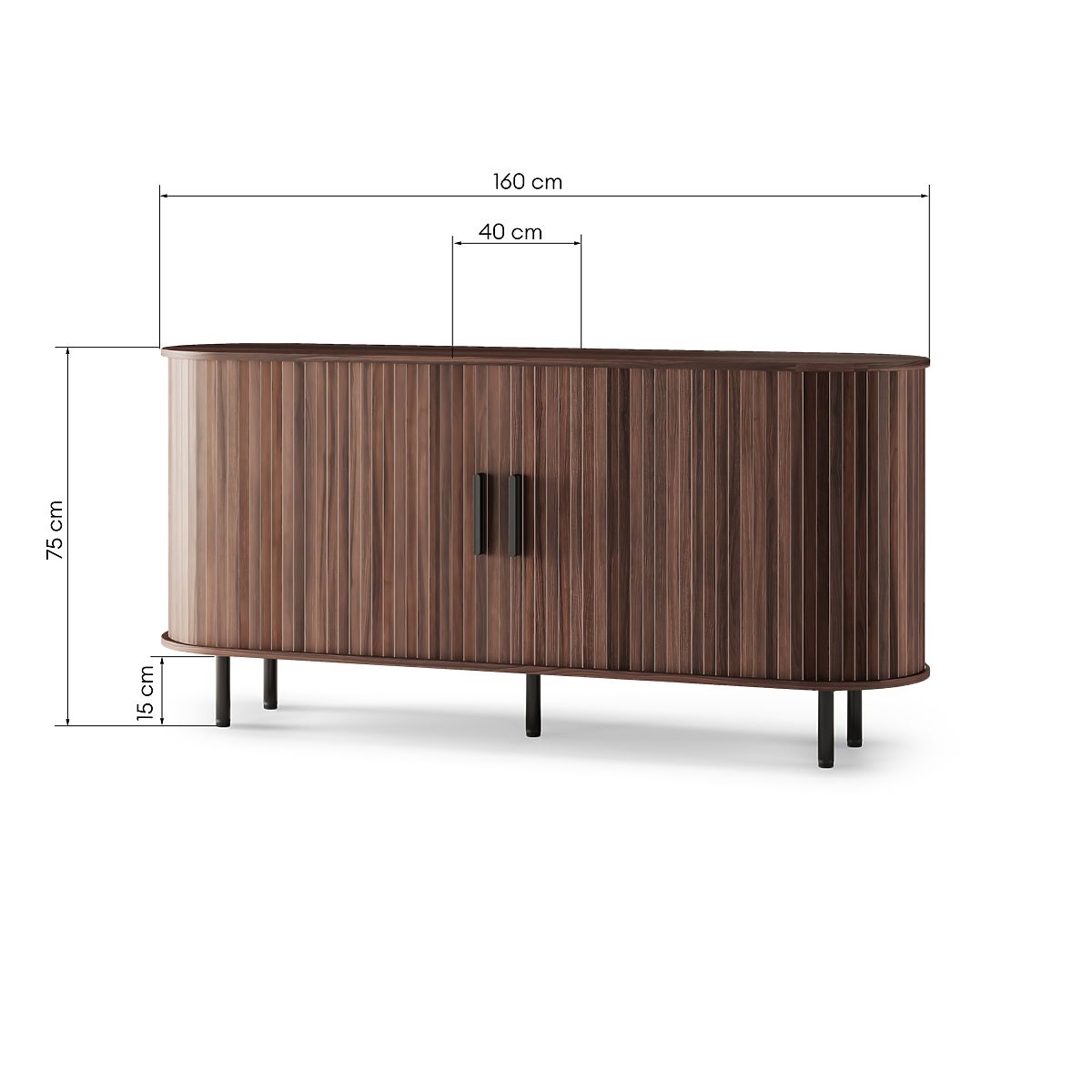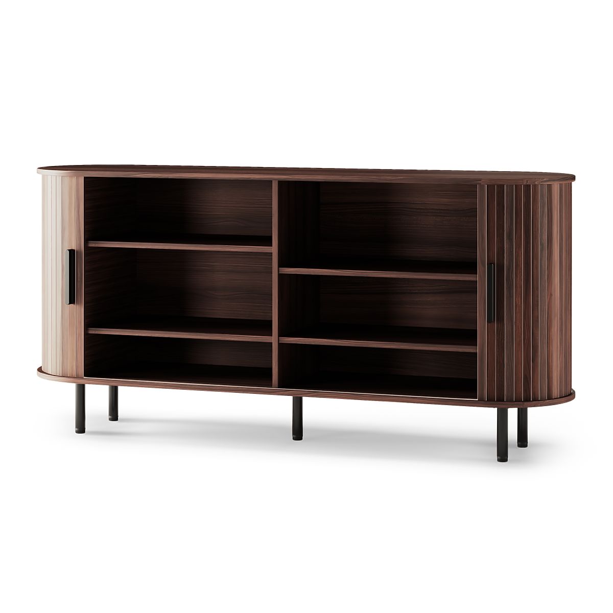 Designerska komoda Gliss z ciemnego orzecha z zaokrąglonymi kształtami i lamelami. .. więcej