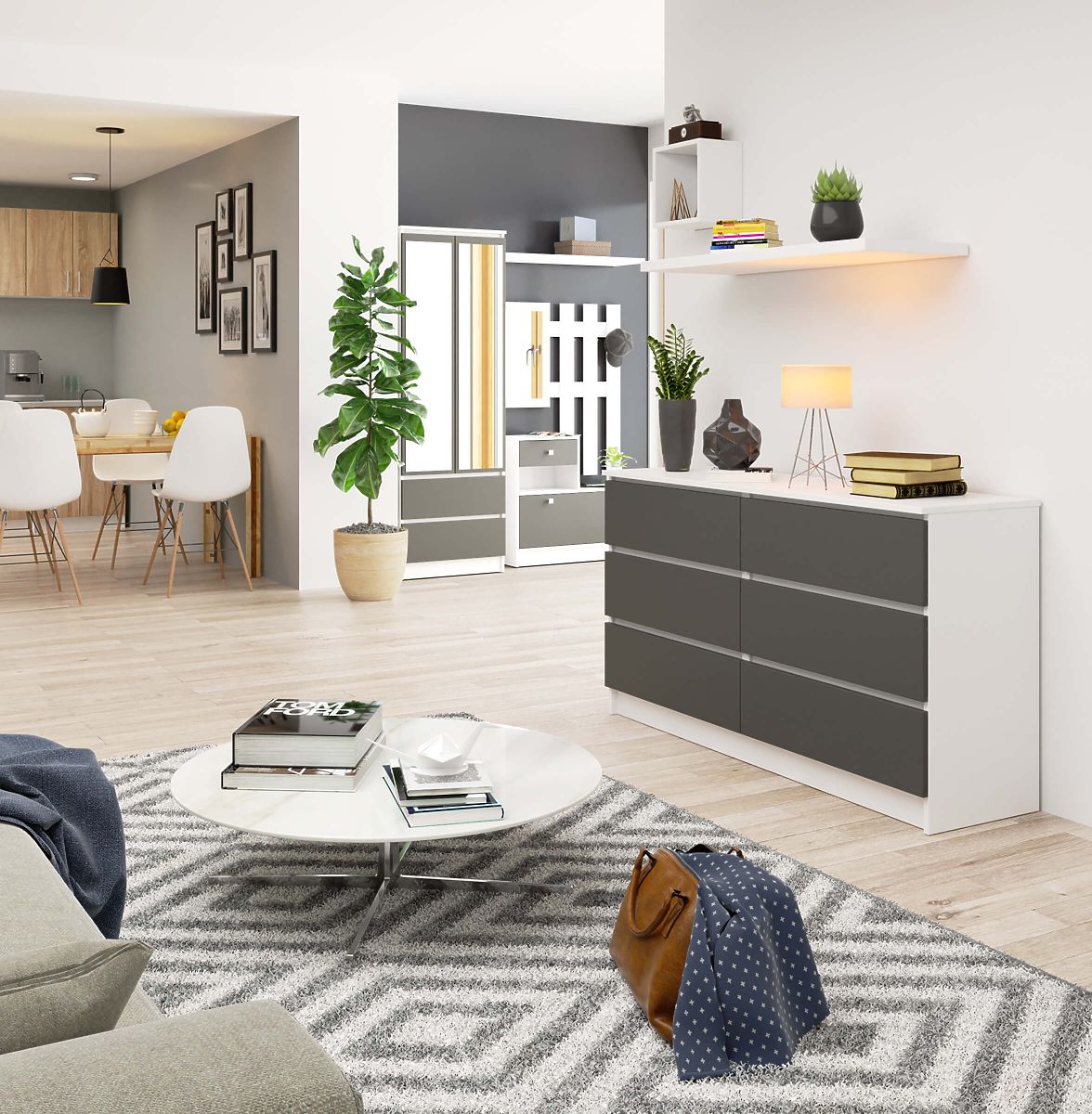 Komoda z sześcioma szufladami w kolorze białym i grafitowym szarym. .. więcej