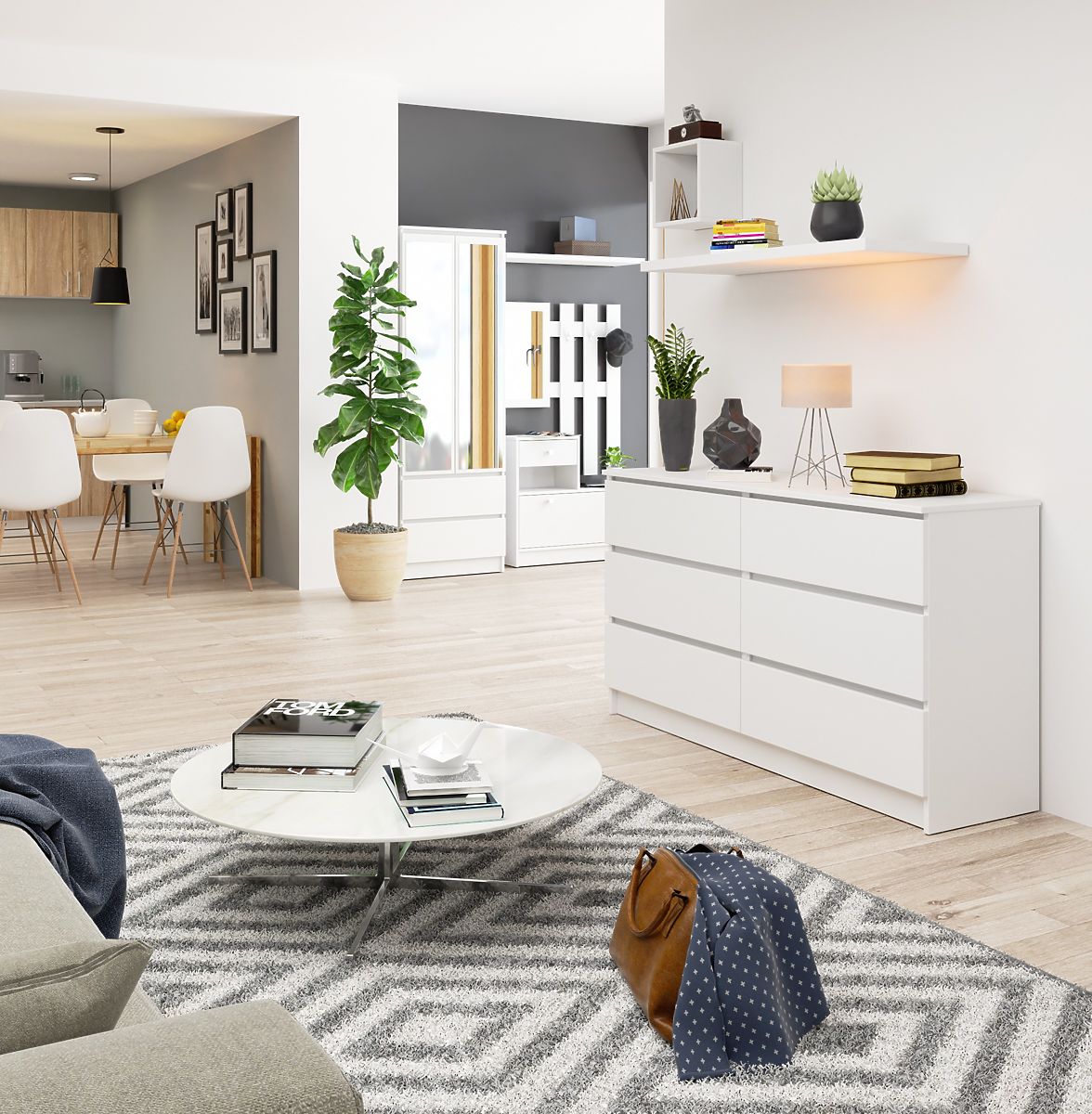 KOMODA K140 6 SZUFLAD to mebel prosty i minimalistyczny w formie. Doskonale pasuje do pomieszczeń o nowoczesnym i skandynawskim designie, gdzie dominują jasne kolory. Ten biały mebel jest idealny do salonu, sypialni, przedpokoju, ale także do biura czy gabinetu. Jego wysokość wynosi 77 cm, długość 140 cm i głębokość 40 cm.