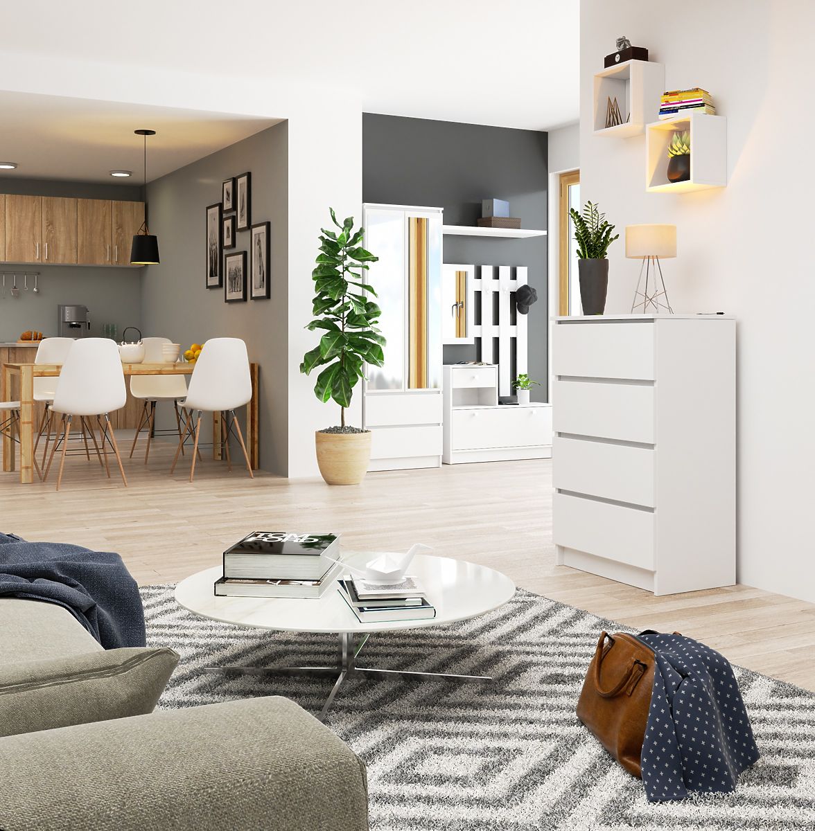 Biała komoda z czterema szufladami do przestrzeni mieszkalnej i biurowej. .. więcej