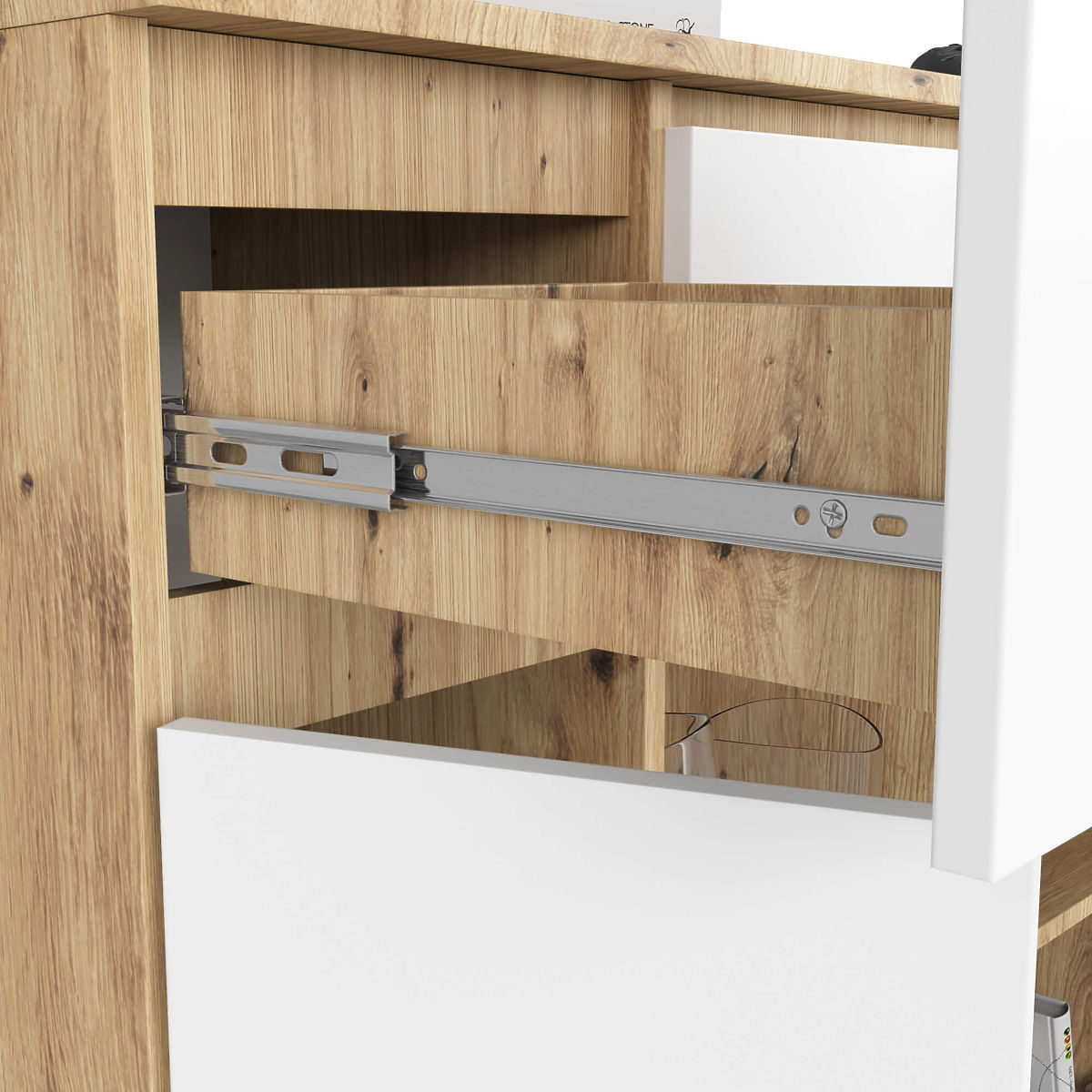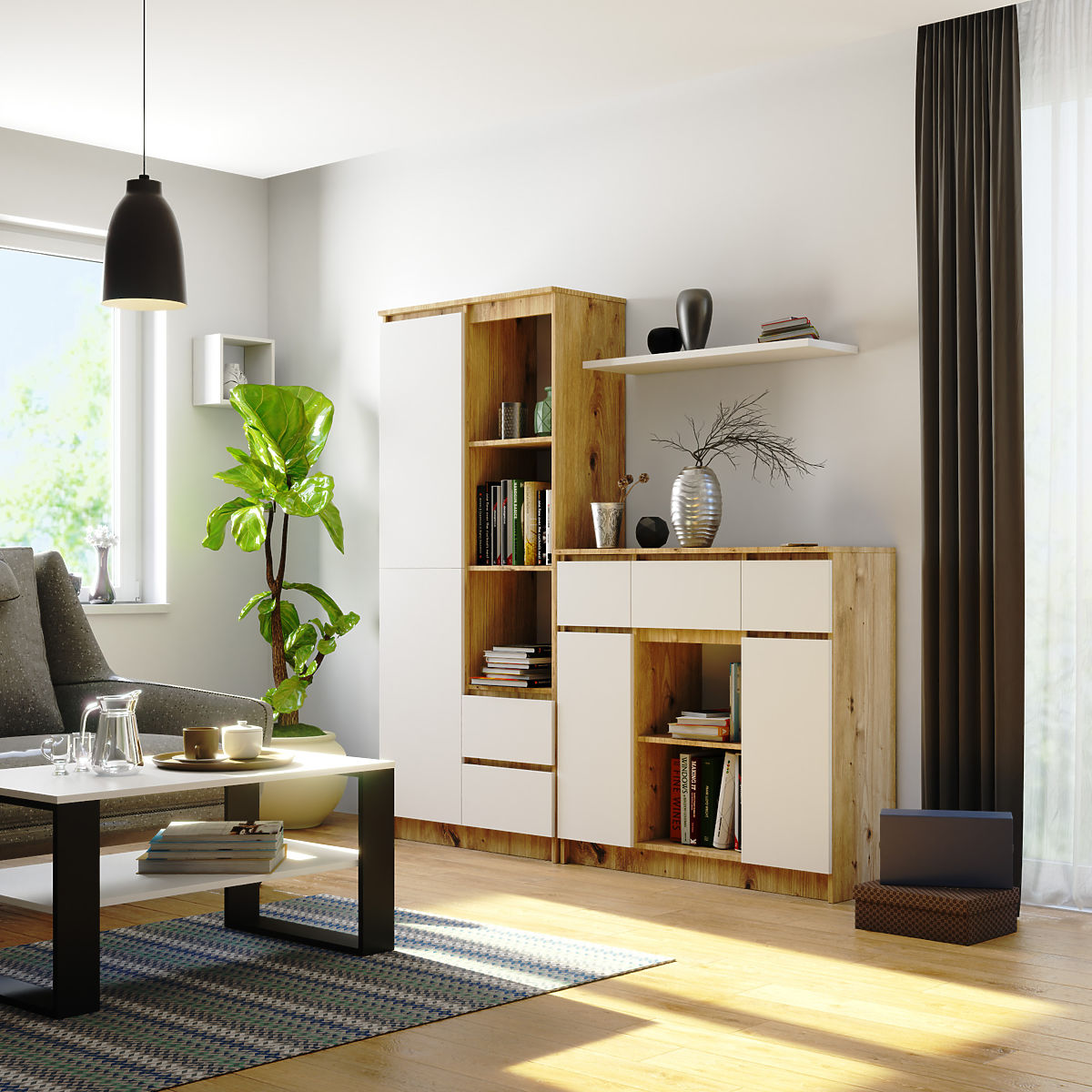 Komoda z trzema szufladami i dwoma drzwiami w kolorze Dąb Artisan i Biała. .. więcej