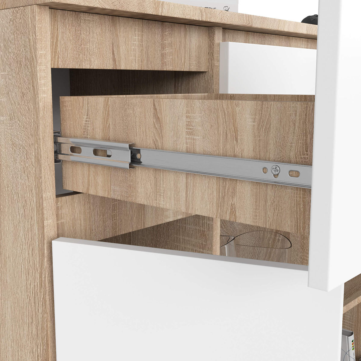 - Szuflady poruszają się na metalowych prowadnicach kulkowych