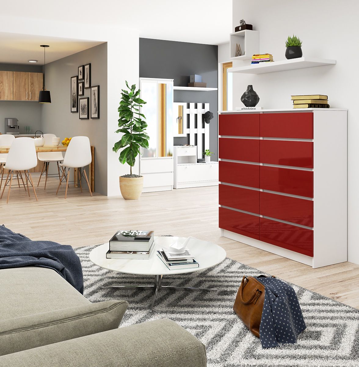 Komoda, model K to mebel o wyrazistym, energetycznym kolorze. Głębokie czerwone fronty z połyskującą powierzchnią i biały matowy korpus wyglądają bardzo interesująco. Wrażenie potęguje połyskliwa struktura, która odbija światło i tworzy na powierzchni mebla efektowne refleksy.