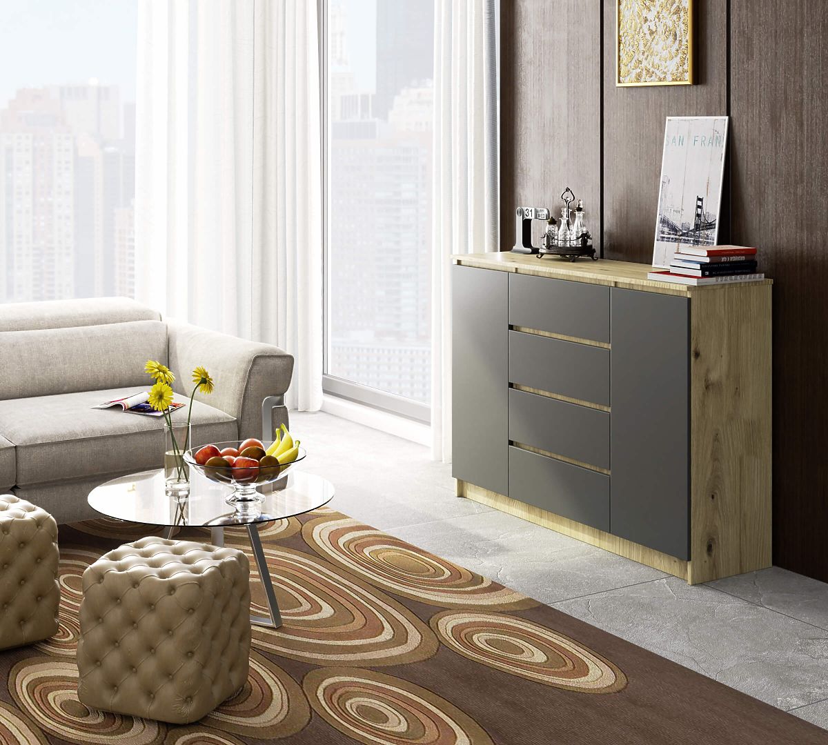 Komoda z 2 drzwiami i 4 szufladami, dąb artisan i grafit szary. .. więcej