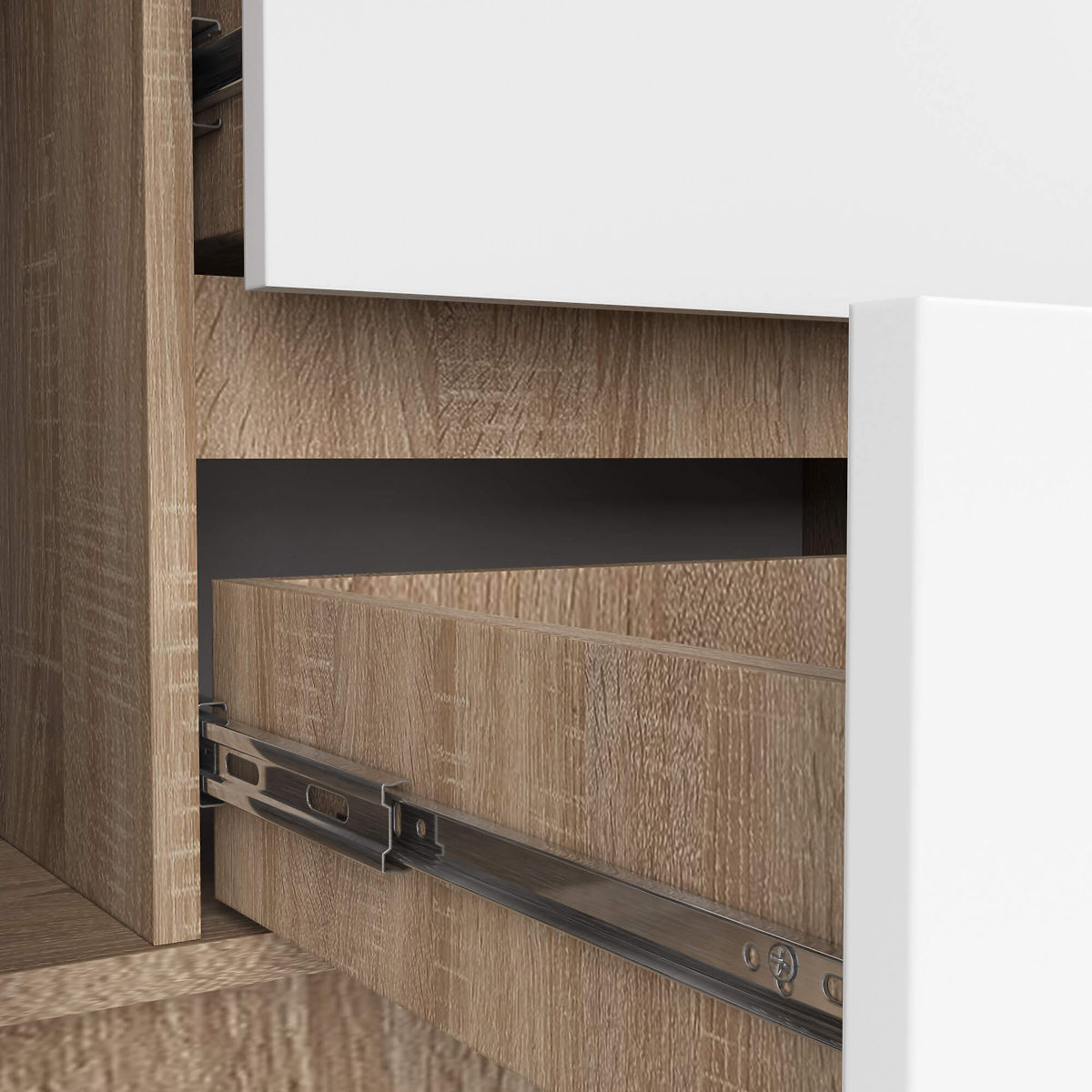 - Szuflady poruszają się na metalowych prowadnicach kulkowych - Krawędzie oklejone obrzeżem ABS zapewniającym wysoką ochronę przed uszkodzeniami