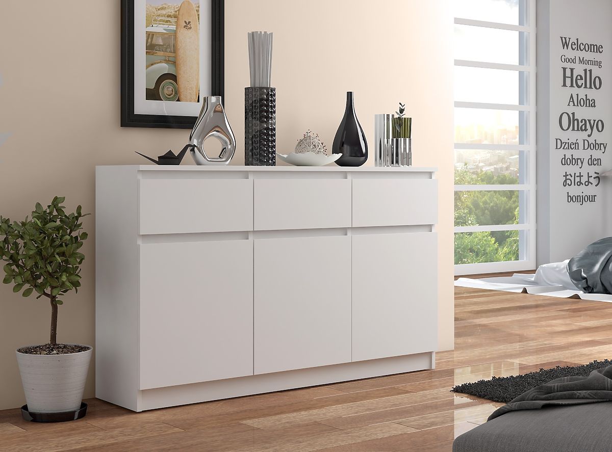 Przedstawiamy niezwykle elegancką komodę, wykonaną z wysokiej jakości laminowanej płyty. Ma grubość 16 mm i jest odporna na ścieranie. Pochodzi od uznanego producenta Kronospan, co gwarantuje jej trwałość. Komoda ma trzy szuflady i trzy szafki. Szuflady poruszają się na metalowych prowadnicach kulkowych, co zapewnia płynność i lekkość przy ich otwieraniu i zamykaniu. Każda szafka ma przestronną półkę, którą można otworzyć za pomocą drzwi. Krawędzie mebla są oklejone obrzeżem ABS, które zapewnia wysoką ochronę przed uszkodzeniami.