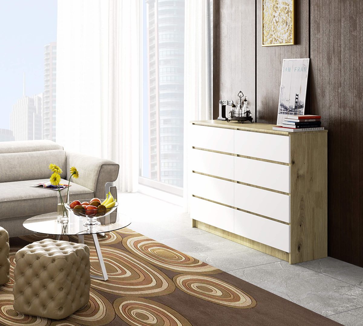 Komoda z 8 szufladami w kolorze dąb artisan i białym. .. więcej